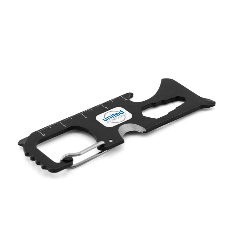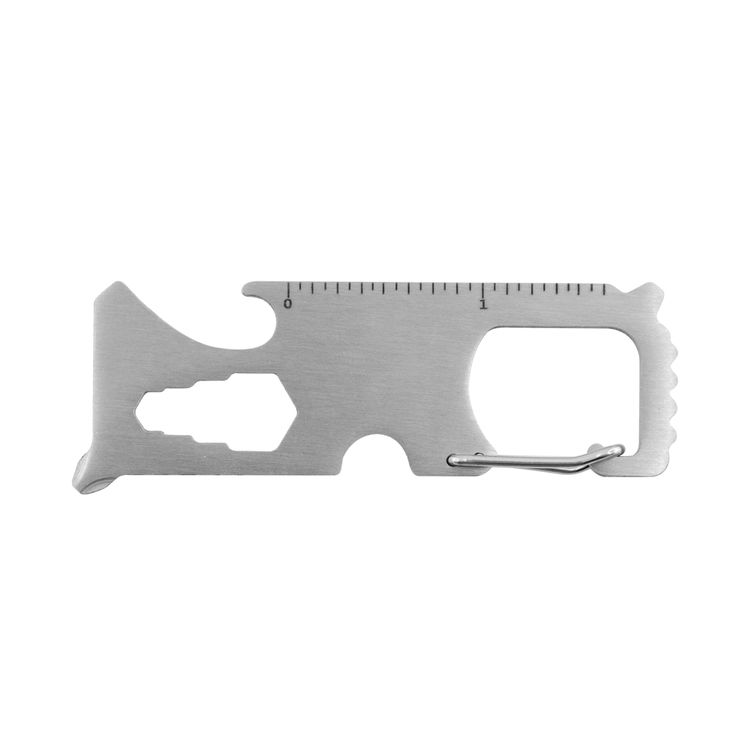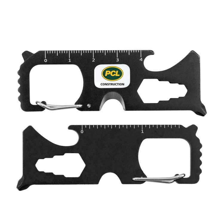 Take care of quick fixes with this 11-in-1 stainless steel EDC multi-tool. Spring-action carabiner attaches easily to belt loops, key rings or bags for easy access. The multi-tool includes a carabiner, 4 position wrench, pencil cutter, bottle opener, 2 screw drivers (Philips and flat head), and 2 rulers (inches and metric). The carabiner multi-tool features sturdy stainless steel construction and a full color laminate imprint. Choice of stainless steel or black metal finishes.
