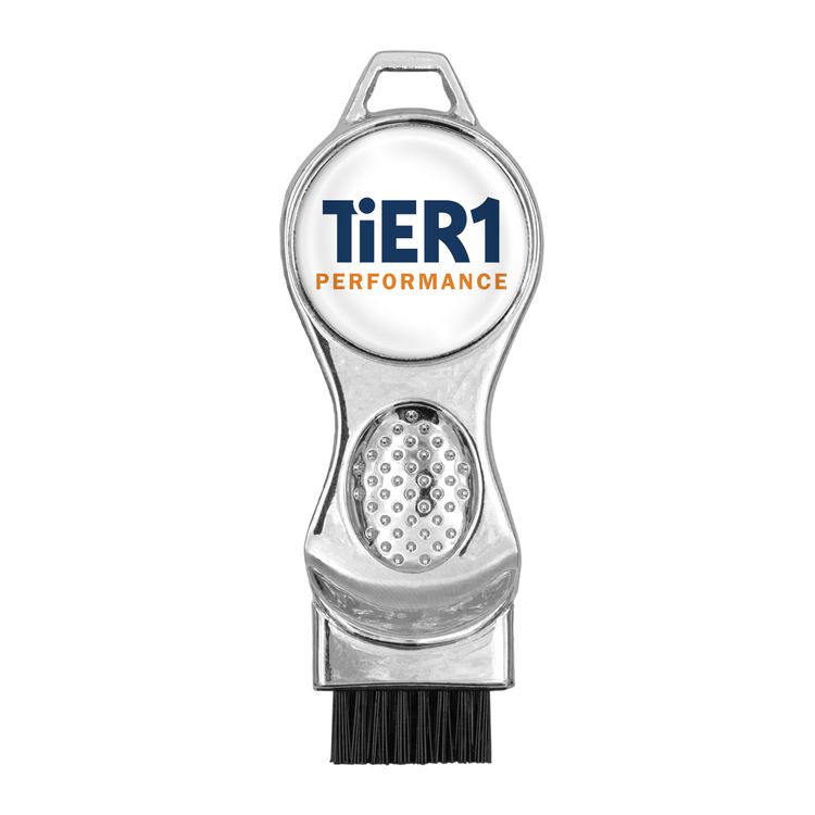 Keep your clubs game ready with the Contour 3-in-1 multifunction die cast golf brush tool. The Contour’s sleek, ergonomic design features a shiny nickel finish, soft textured PVC grip, and thumb rest for superior leverage. Brushes include an integrated golf club groove cleaner and removable ball marker with full color poly dome imprint. Choose from 3 popular handle colors. Fast 6 working day production standard.