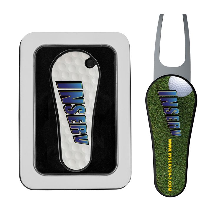 New from Pitchfix! Introducing the Pitchfix Flash golf divot repair tool. Crafted from high quality ABS and sturdy stainless steel divot blades, the Pitchfix Flash features the patented Pitchfix switchblade function and a two-sided grip imprint for double the impact. The extra-large full color imprint areas are perfect for co-branding, recognizing tournaments sponsors, or showcasing golf course photos. Pricing includes divot tool packaged in Deluxe Grey Window Tin. Fast 6 working day production standard. Golf ball marker not included. Setup charged per design.