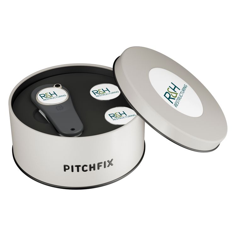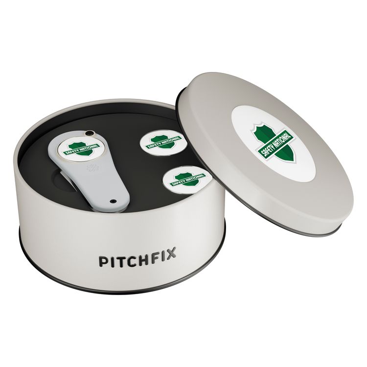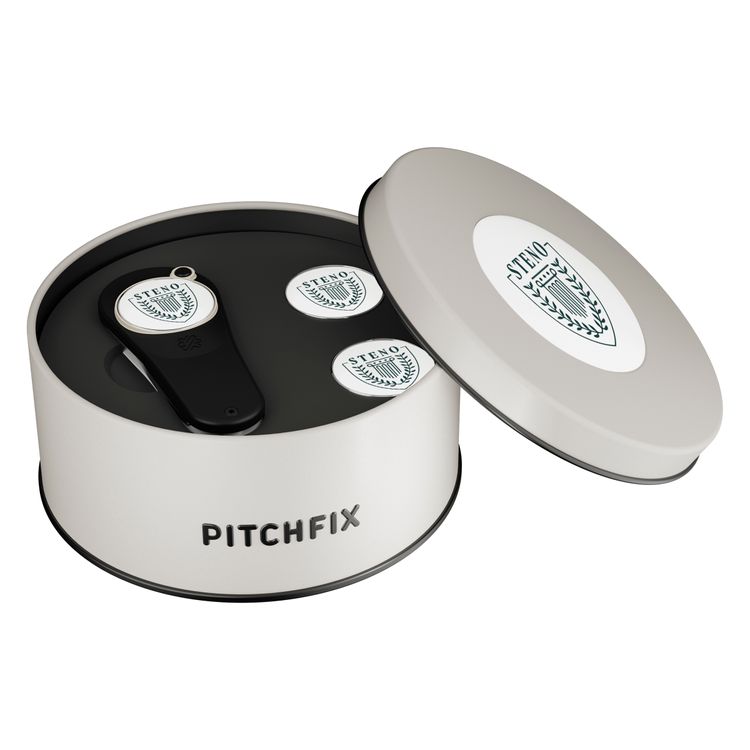 New for 2025! The newly designed Pitchfix Original 2.5 golf divot repair tool. Crafted from high quality Premium ABS and sturdy stainless steel divot blades, the Pitchfix Original is available in 5 vivid grip color combinations to match your brand identity. Pitchfix golf divot repair tools feature the patented Pitchfix switchblade function and removable golf ball marker with full color dome imprint. Fast 6 working day production standard. Pricing includes divot tool packaged in Deluxe Grey Round Tin with imprinted lid and 2 extra ball markers. Perfect for golf tournament sponsorships, giveaways, and outing gifts.