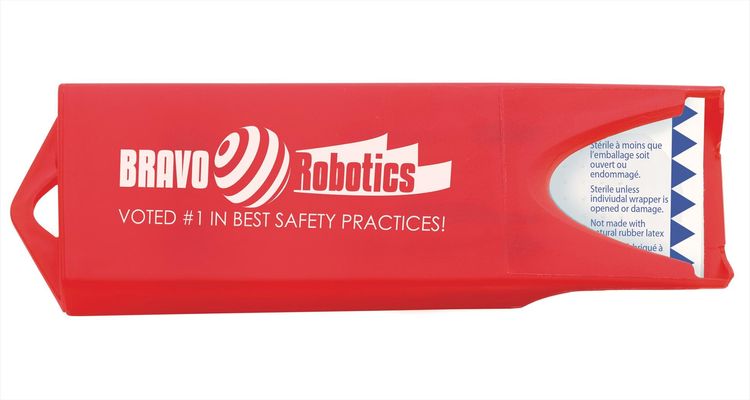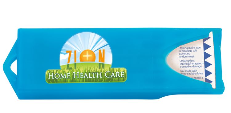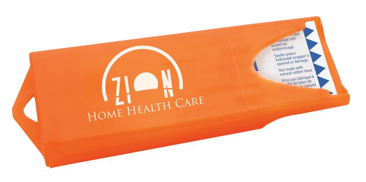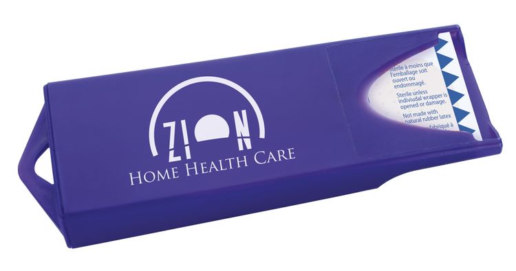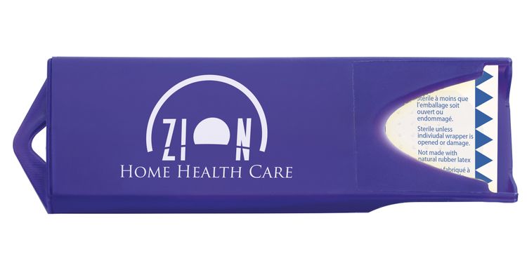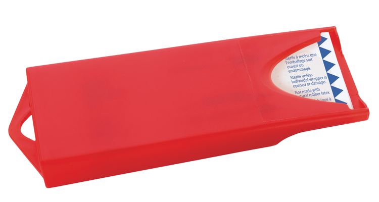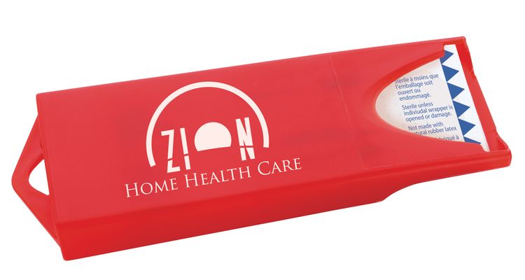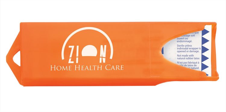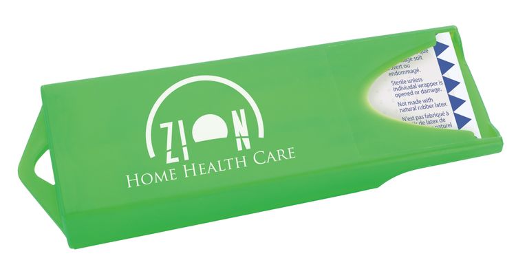 This brightly colored bandage dispenser is great to carry with you when you travel or to keep in your daily bag. It includes 5 clear bandages in a refillable translucent dispenser. Additional decoration charges may apply.