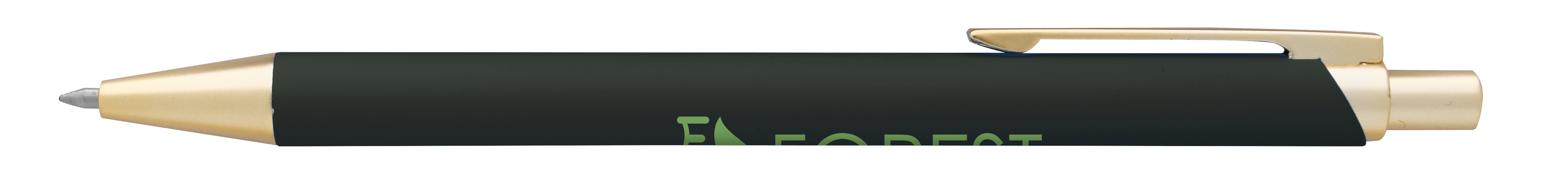 Renew your writing style with this plunger-action, fine-point gel pen with lavish gold trim. This writing instrument doesn’t just look good, however. Underneath the eye-catching design lies a barrel made with 100% recycled aluminum, proving mindful materials can co-exist with fashionable finishes. Add in its soft-touch rubberized finish, and you’ll be writing in comfort and style. Plus, it comes with fraud-resistant ink. Additional decoration charges may apply.
