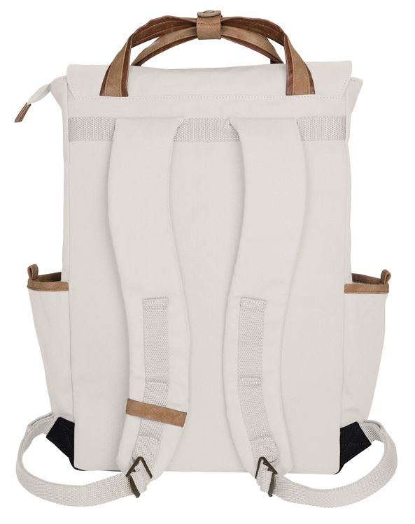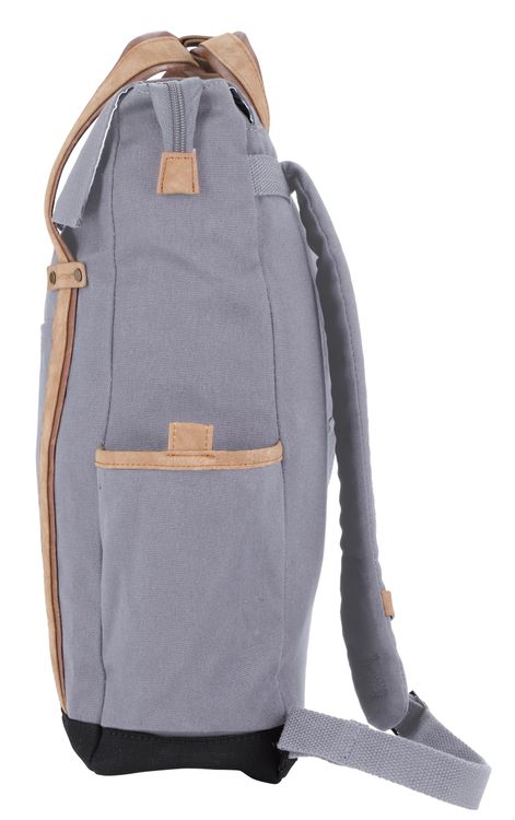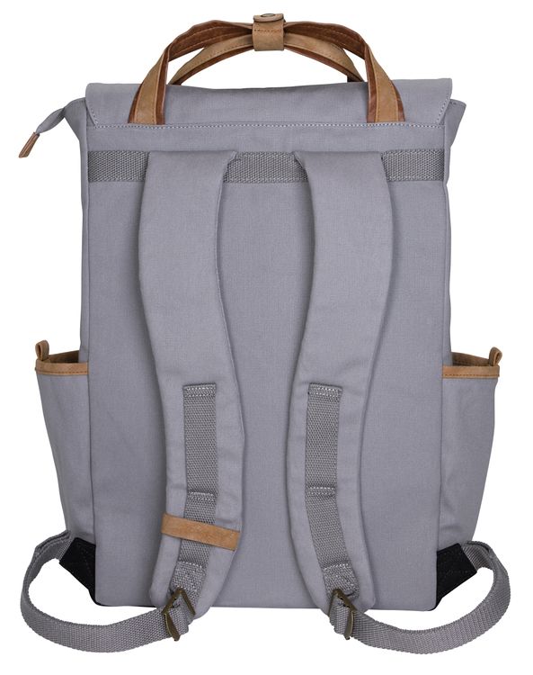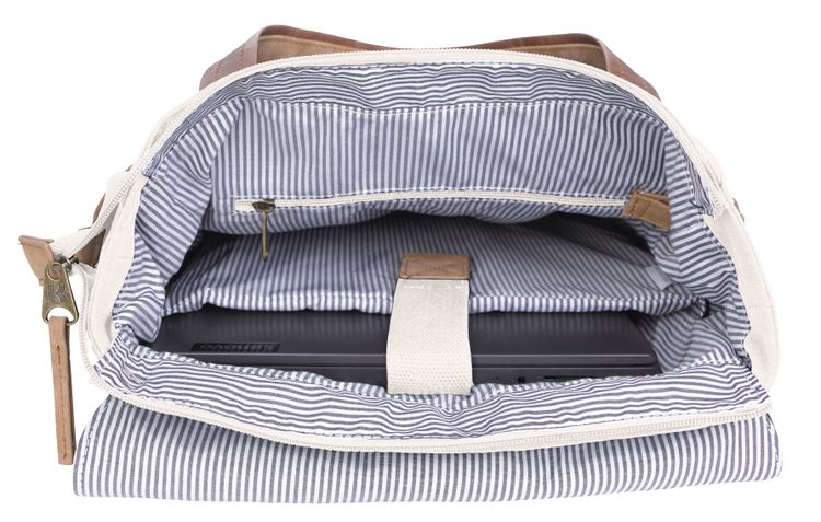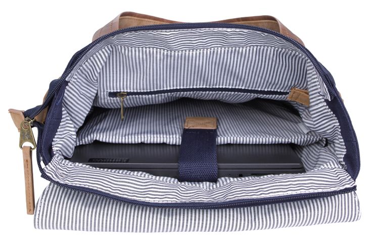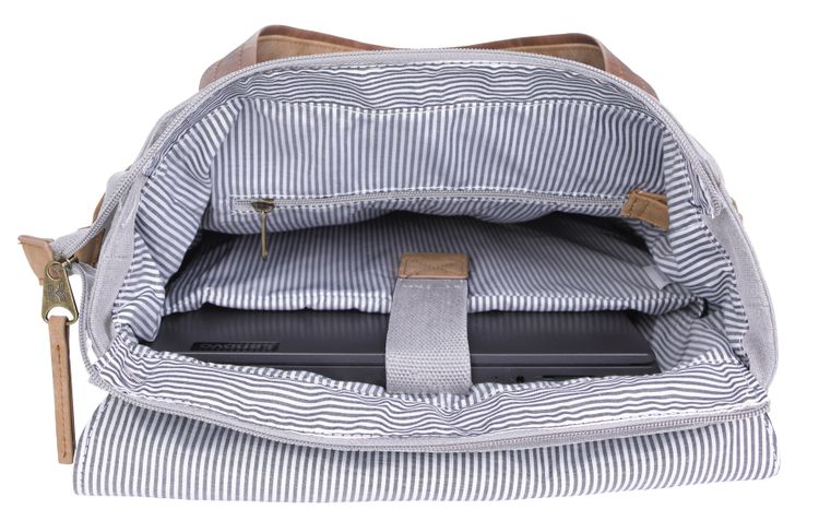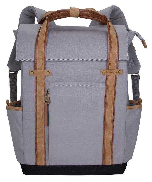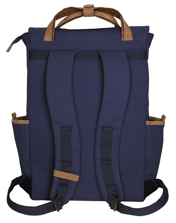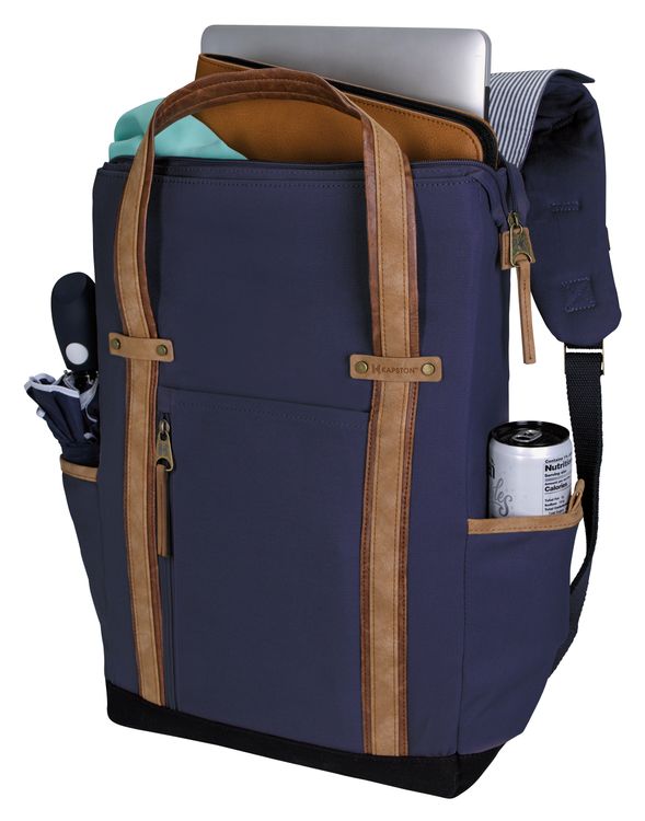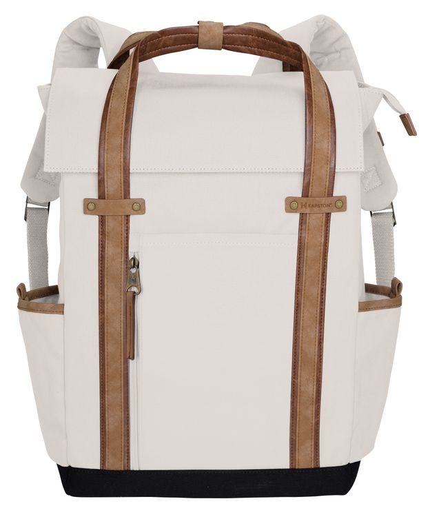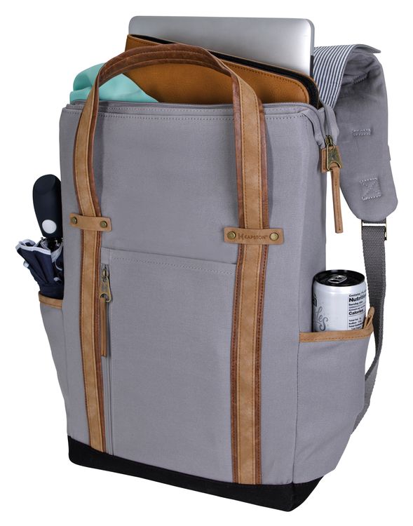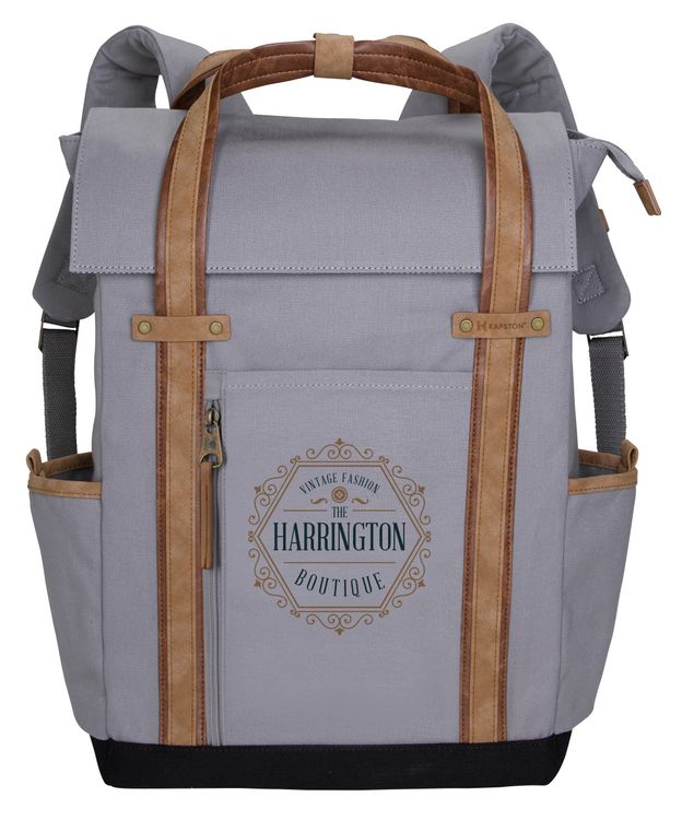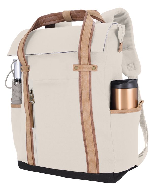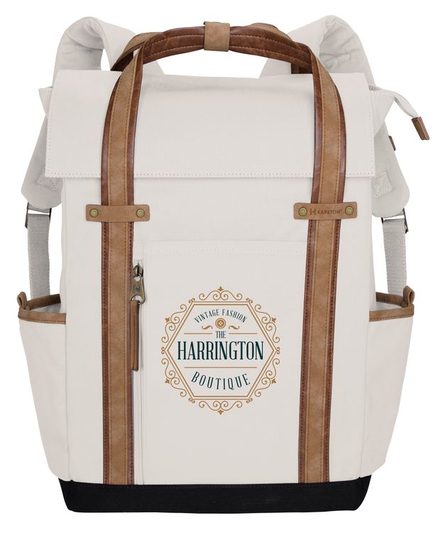 This premium cotton backpack has a stylish and sophisticated design that is perfect for work, school, or travel. Added details like its striped interior lining and PU and suede carry handles take it to the next level. Fits most laptops up to 17”. To ensure fit, please order a sample as laptop measurements may vary. Approximate PMS colors of Strap are: Lt. Brown = PMS 4645 and Dk. Brown = PMS 477 Additional decoration charges may apply.