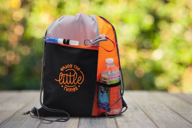 Easily transport your belongings around campus, to and from the gym, or on a relaxing walk through nature in this Drawstring Sport Pack. It cinches tightly using the double-drawcord closure, keeping your items secure. Color accents against the grey-and-black design add some color to this utilitarian bag. Other features – a mesh side pocket, front slip pocket, and pen loop – add to its practicality. Additional decoration charges may apply.
