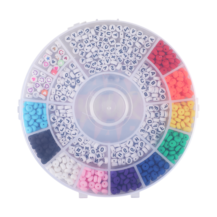 Kit includes 260 letter beads (10 of each English alphabet letter), 400 color beads (40pcs of 10 colors), 30 mixed smiley and heart beads