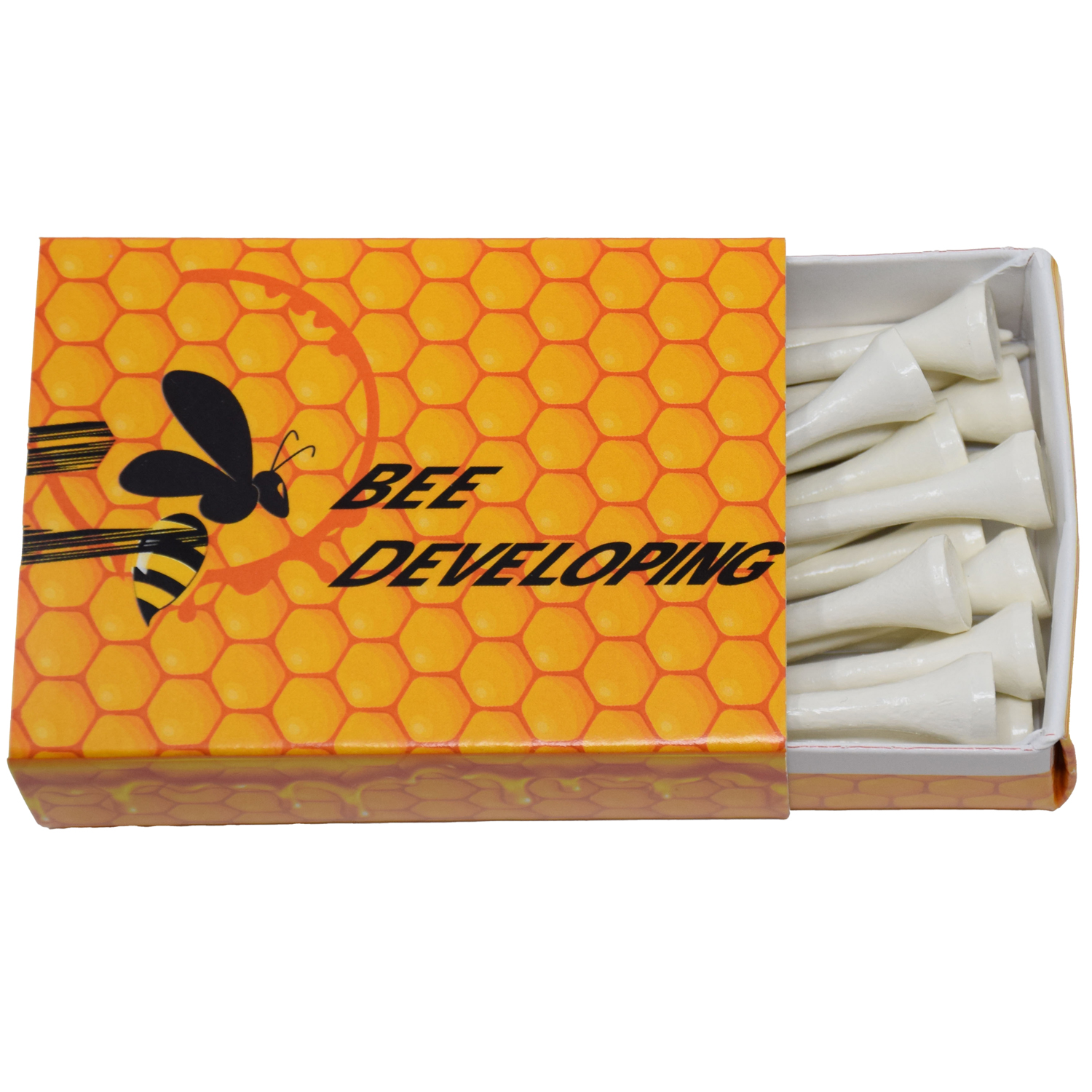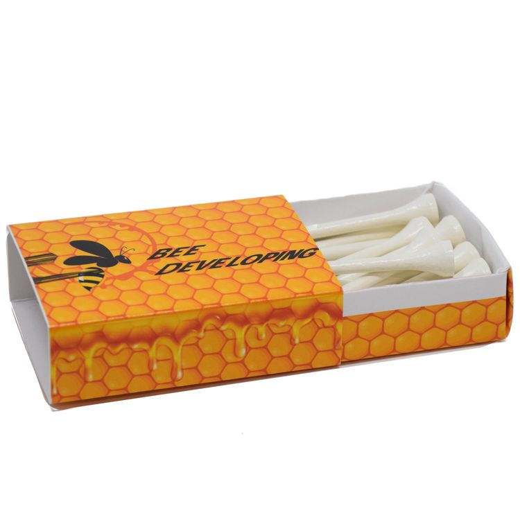 The custom slide open box of golf tees containing approximately 15 white wood 2-3/4" tees. The tees come stock blank, allowing your logo to stand out on the packaging. The box features a full-color, custom-imprinted sleeve & tray that delivers strong brand visibility in a compact, giftable format.