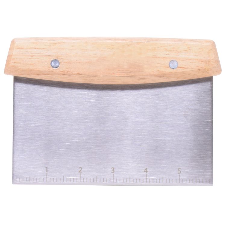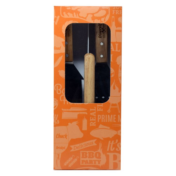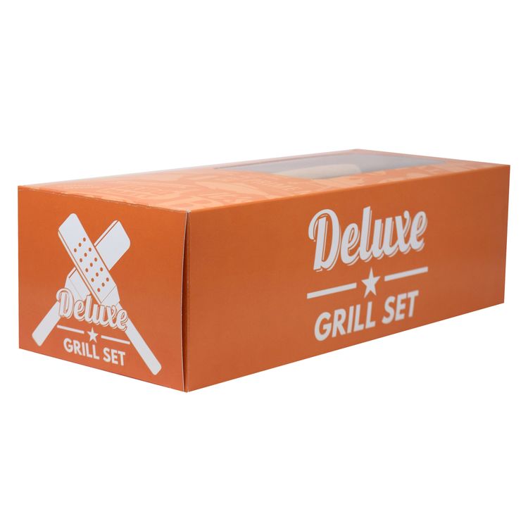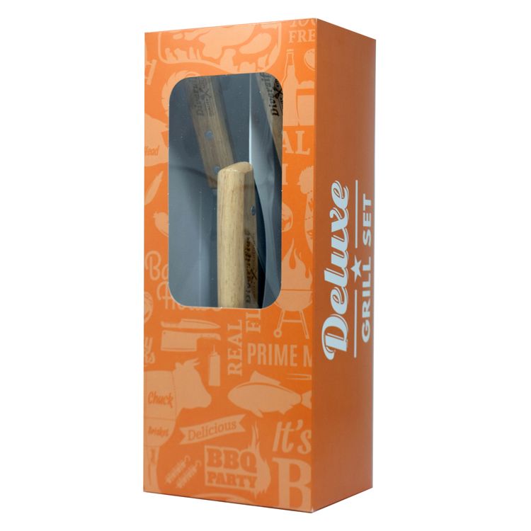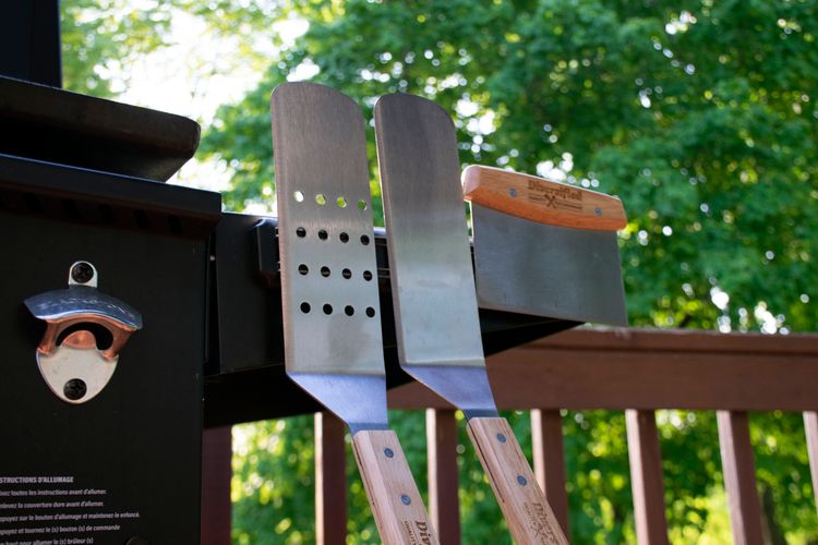 This deluxe grilling set contains two flippers and a scraper/chopper. One flipper is a solid blade, and the other is a perforated blade. Both feature a beveled edge for scooping food on a flat-top grill or surface. The flipper's angled handles provide ergonomic use while keeping hands away from heat. The Scraper/Chopper is made of heavy-duty stainless steel with a wooden handle. The stainless-steel blade includes quarter-inch markings for easy measuring.