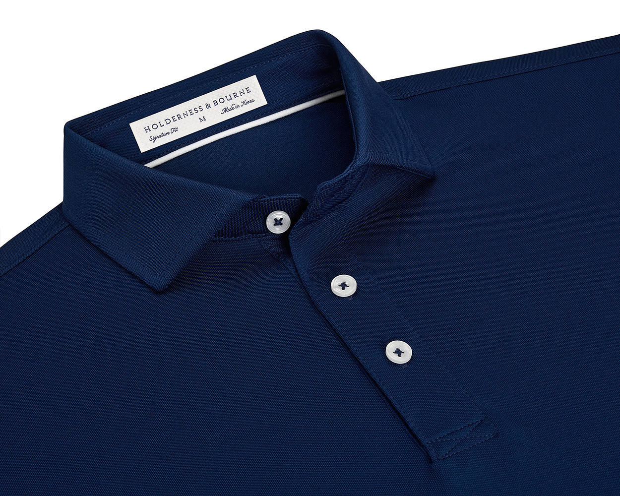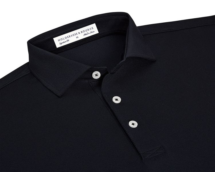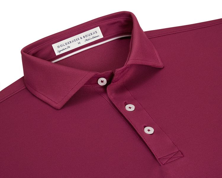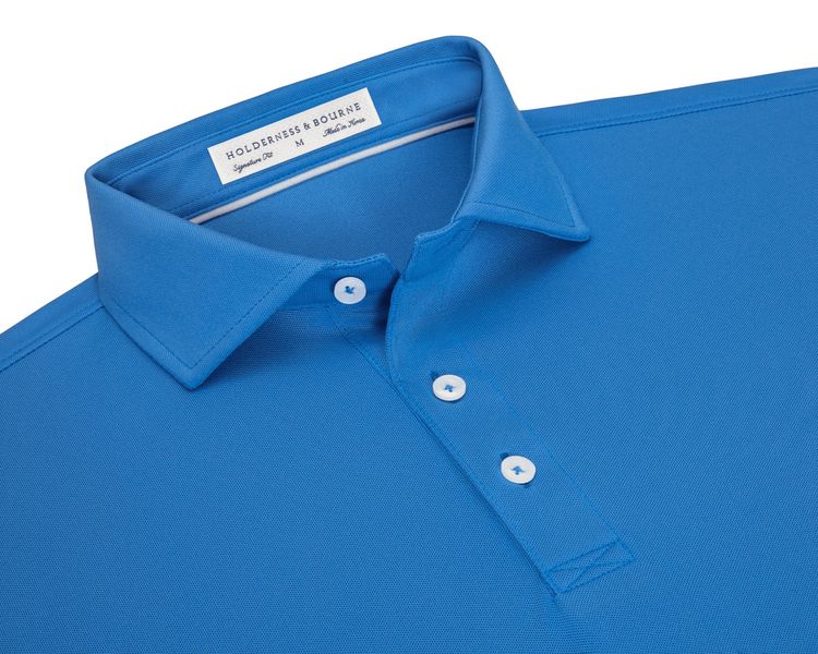 Our original solid performance pique design, The Macdonald golf shirt offers breathable comfort in warmer weather thanks to a blend of lightweight synthetic and stretch fibers. A modern take on the classic solid polo shirt, with contrast collar band piping for elevated style. Finished with our signature structured spread collar, genuine trocas shell buttons, and H&B tailored fit.