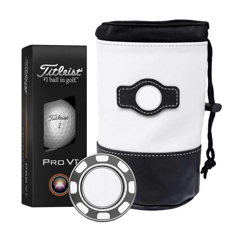 Designed for the performance golfer, this premium golf kit includes three Titleist Pro V1 golf balls and a metal poker chip ball marker with a removable ball marker. The chip offers a solid, high-quality feel and features a sleek metallic finish for a refined look on the course. The center ball marker easily pops out for convenient use during play. Everything is packaged in a synthetic leather valuables cinch pouch.