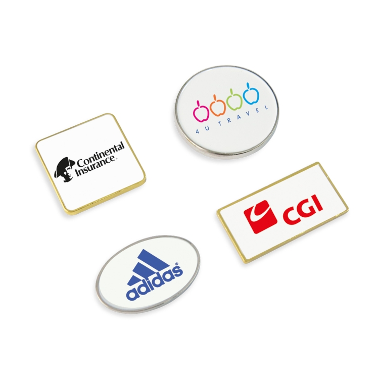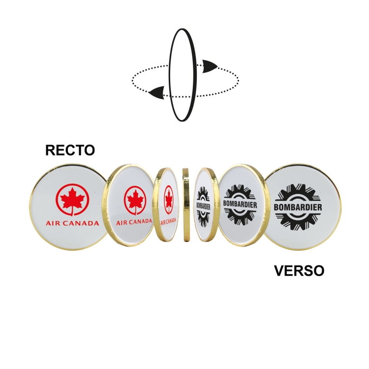 Standard round shape 2 sided magnetic lapel pin with white enamel fill and one color printed logo on each side. Includes attachment: Strong magnet "C