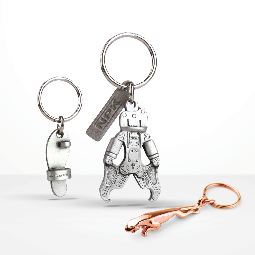 3D key chains are custom priced. Available with a variety of attachments and finishes.