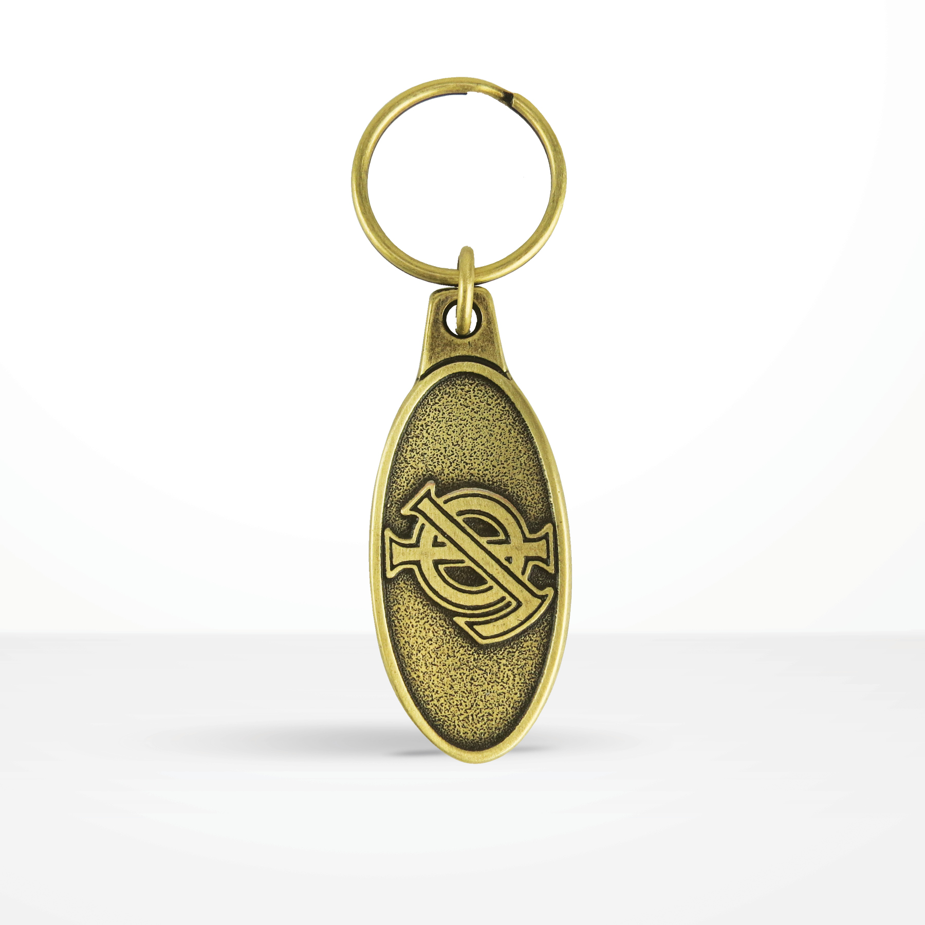 Die Struck Custom shape key chains with one or two sided logo for your next promotional campaign. Includes 1-sided die struck logo design with split key ring attachment. Other key chain and key tag attachments available. Available in antique gold, antique silver and antique copper metal finishes. Machine polished key fob.