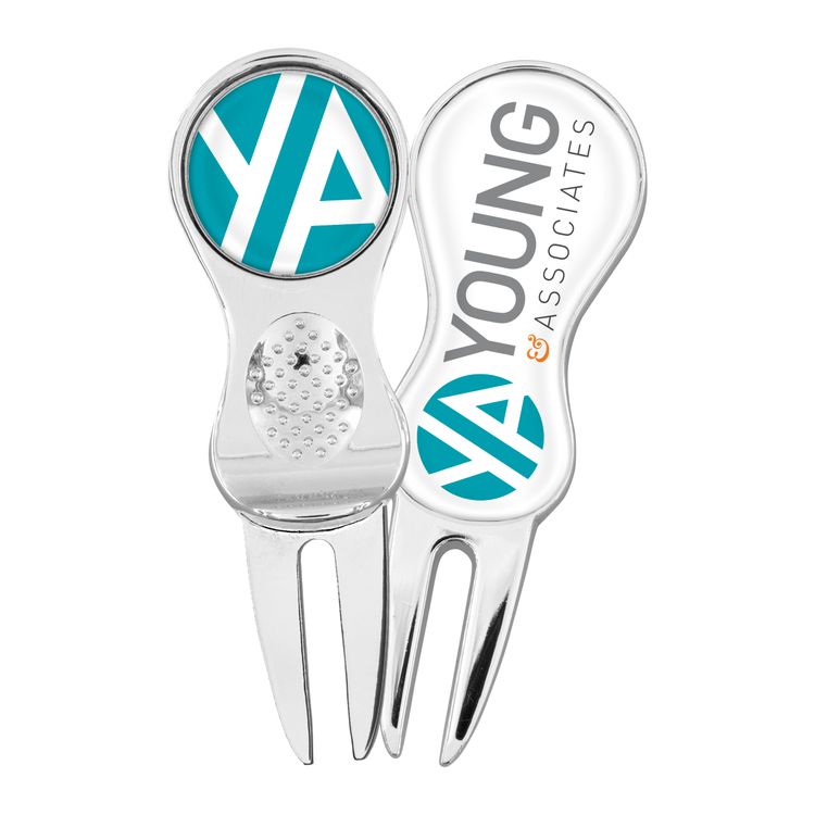 Keep your brand highly visible on the green with the Arc XL golf divot repair tool. The sturdy die cast design features an ergonomic grip and molded thumb rest for superior leverage and control. Pricing includes a removable golf ball marker with full color poly dome imprint and an extra-large full color dome imprint on the divot tool grip. Choose from bright nickel or black nickel metal finish or blue, green, or red color metal. Multiple imprint locations allow for co-branding and golf tournament sponsors.