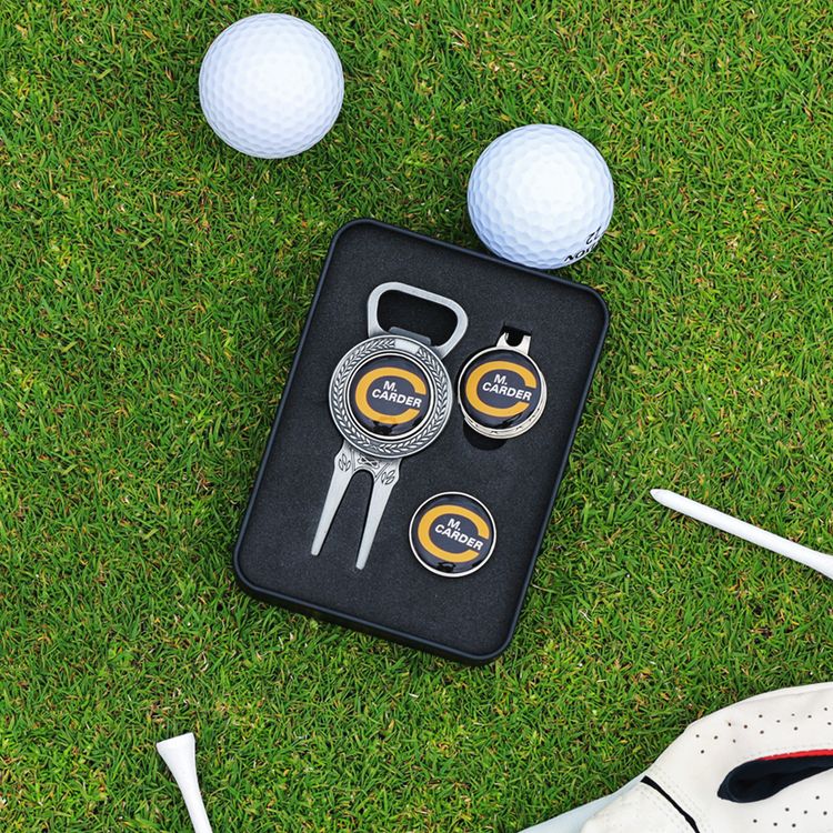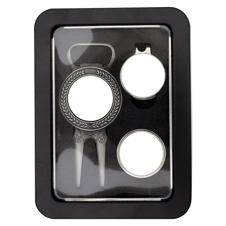 Here's a gift set that sure to be a hole in one at your next golf event. Inside of this handsome gift box you'll discover our best-selling golf divot tool (DVT06) with an integrated bottle opener and removeable 1" ball marker with full color dome imprint, a golf hat clip (GHC012) with full color dome ball marker and a 1" full color dome lapel pin. It's perfect for commemorating events and recognizing achievement!