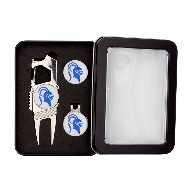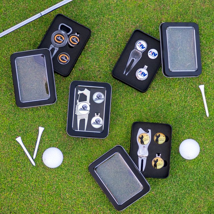 Here's a gift set that sure to be a hole-in-one at your next golf event. Inside of this handsome window tin gift box you'll discover our best-selling and multifunction Golf n’ Brew divot repair tool (DVT08), textured golf hat clip (GHC012), and extra ball marker imprinted with a with full color poly dome. Multiple imprint locations allow for co-branding and golf tournament sponsors. Just add an additional setup charge per design.