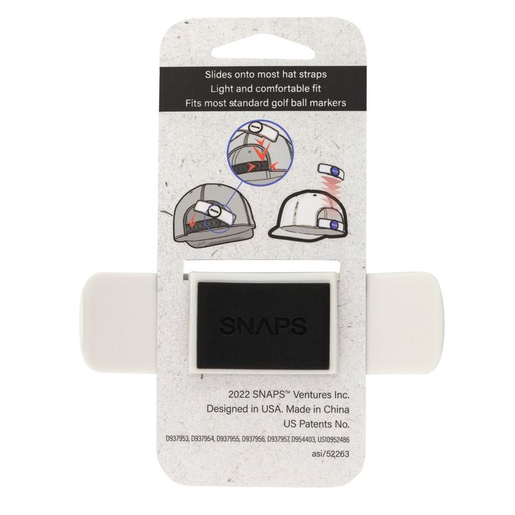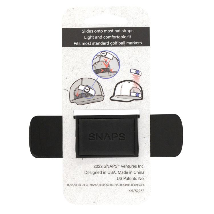 As seen on your favorite golfer’s cap, the SNAPS Hat Strap Clip is the premier golf headwear accessory brand for making your mark on and off the course. The patented design clips easily to most adjustable hat straps for convenient access to your golf ball marker and highly visible branding. Crafted from soft touch rubberized ABS, SNAPS features golf ball textured silicone inlays and a full color textured removable ball marker. The light weight design slides easily onto most hat straps for comfortable all day wear. Choose from matte black or matte white colors to coordinate with your logo, golf tournament, or event branding. Fast 6 working day production.