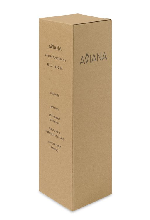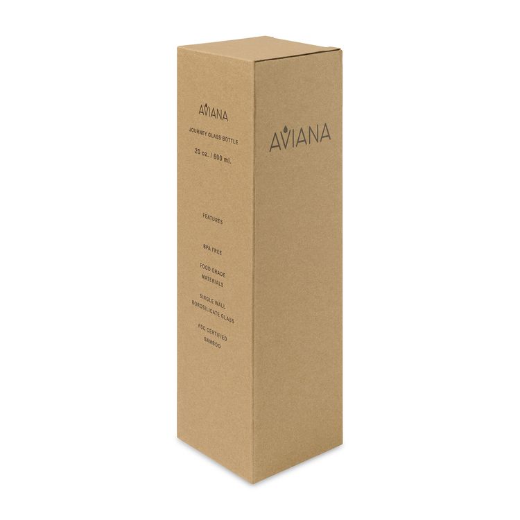 Avianaâ„¢ Journey Glass Bottle - 20 Oz 20 oz. capacity Not intended for hot beverages BPA Free and PVC Free Product One-piece retail gift box included (3"L 10.2"H 3"W) Note: This product contains bamboo, which is a natural material. Color and pattern variances are to be expected Bamboo is a natural, renewable material FSC SBN Additional decoration charges may apply.