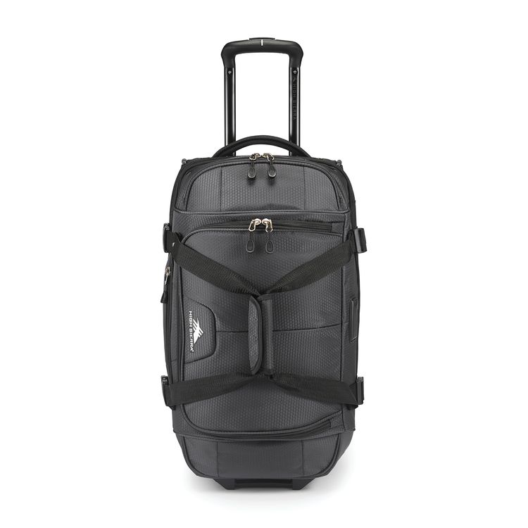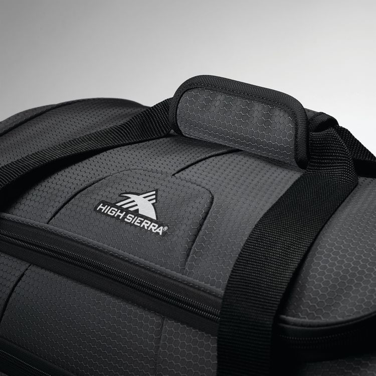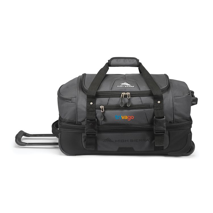 The High Sierra® Fairlead 22" Drop Bottom Wheeled Duffel offers compact yet versatile packing with a roomy main compartment, drop-bottom section with garment straps, and multiple zip pockets. Built for smooth travel, it features in-line skate wheels, a telescoping handle, and reinforced compression straps. Carrying handles at top Molded ID holder In-line skate wheels Additional decoration charges may apply.