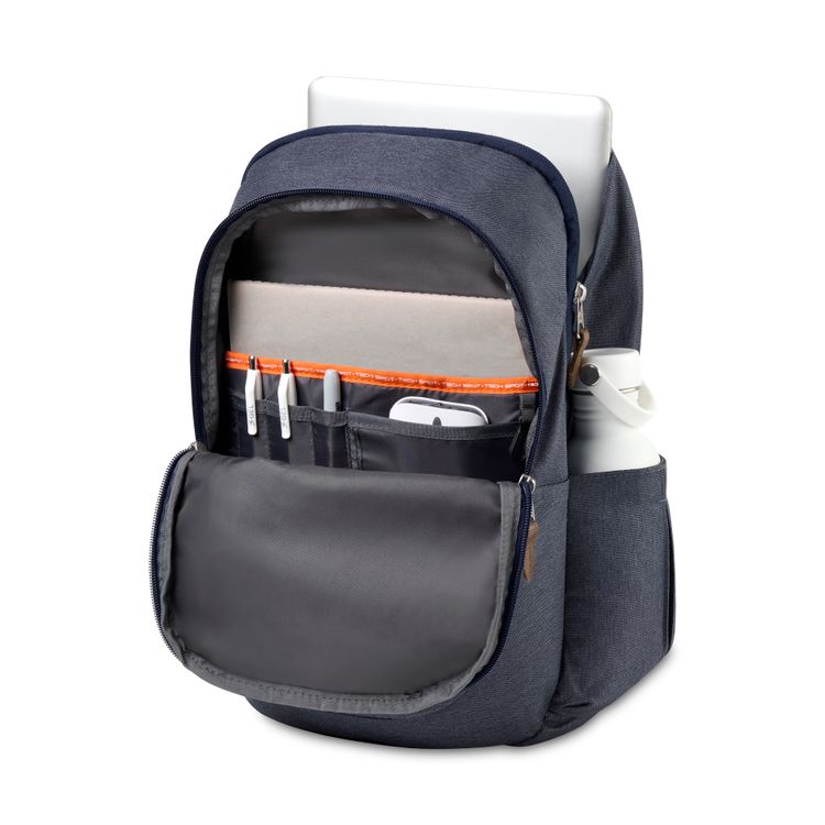 Gusseted front pocket with multi-pocket organizer and fleece lined TECH SPOT tablet sleeve (fits up to a 14" tablet)