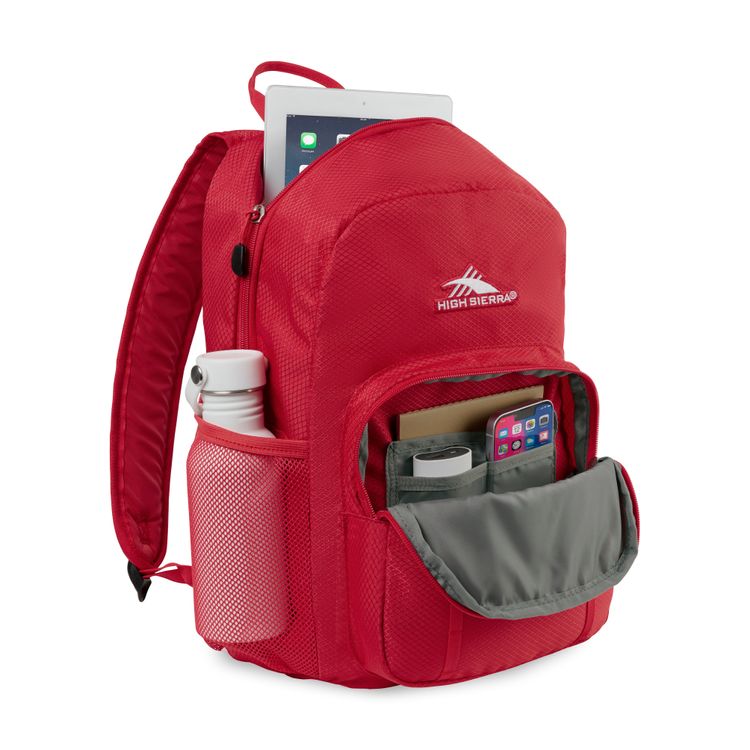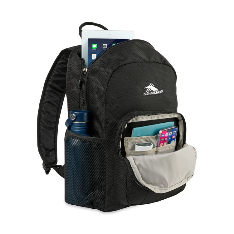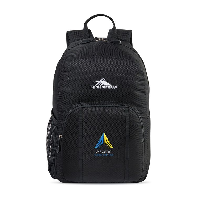 The High Sierra® Pilsen Backpack is built for work, school, or travel with a roomy main compartment, 14” tablet sleeve, and gusseted organizer pocket. With padded straps, a side beverage pocket, daisy chains for gear, and a grab handle, it’s ready for everyday carry. Convenient top grab handle Additional decoration charges may apply.