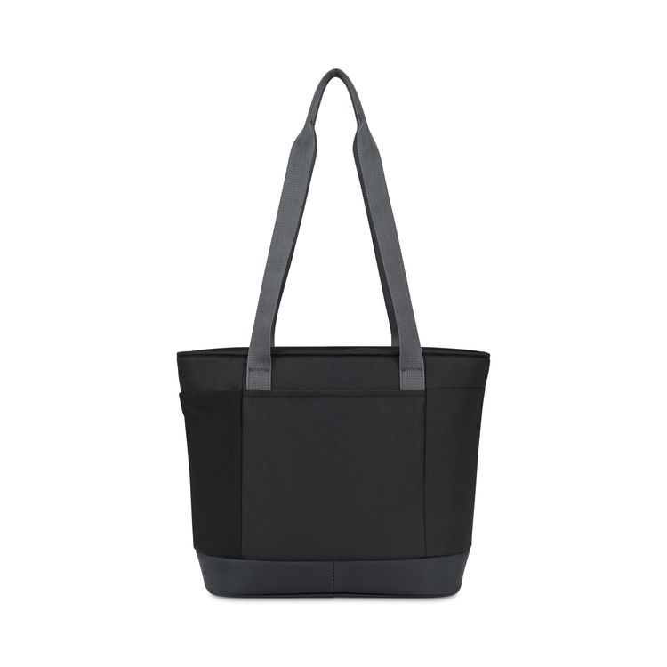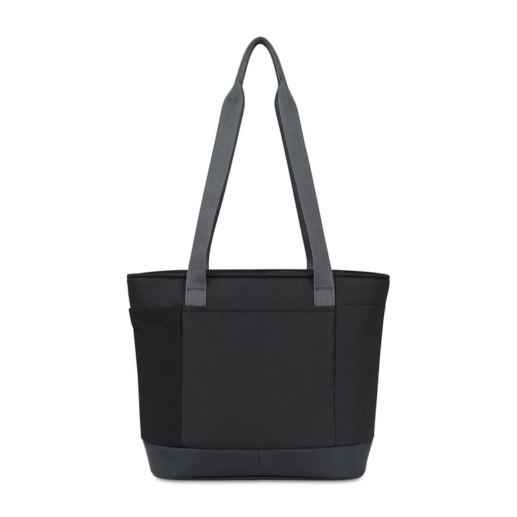 Designed for optimum carrying convenience— zipper closure, fixed webbing straps, and a stretch mesh pocket for your drink