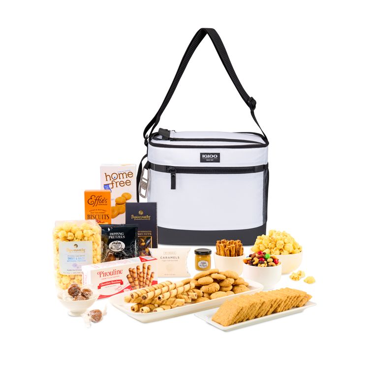 Celebrate Good Times with this stylish Igloo® Maddox Deluxe Cooler that arrives bursting with an abundant array of marvelous gourmet treats nestled inside. Cooler includes Hammonds® Sunny Day Super Snack Mix (7.5 oz), Hammonds® Sweet & Cheesy Popcorn(5 oz), Milk Bar Crunchies Pretzel-y Chocolate Chip Cookies Pouch, 88 Acres Dark Chocolate Sea Salt Seed Bar (1.6 oz), East Shore Sween N'Tangy mustard (1.5 oz) and dipping pretzels (2 oz) Food Net Weight: 1.5lbs Select a complimentary ribbon in your choice of colors: white, red, navy blue, royal blue, black, or grey (If a ribbon color is not selected, the item will come with a white ribbon) Food contents may vary from what is shown, based on available inventory a substitute of similar or greater value will be used SBN Additional decoration charges may apply.