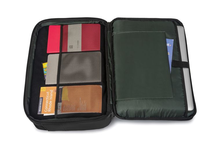 Zippered, padded computer compartment (fits up to a 17" laptop) opens flat to expedite airport security check-in includes a tablet pocket (fits up to a 10” tablet)