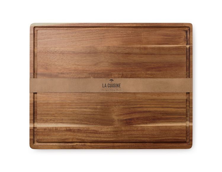 A timeless kitchen essential. The La Cuisine Carving & Cutting Board is crafted from renewable acacia wood, combining beauty and durability. Finished to highlight its natural grain, each board is unique and designed to protect blades while providing a stable surface for carving. A built-in juice channel captures drippings for gravy, while rubber levelers ensure balance. Handsome enough for display, functional enough for everyday use. Each La Cuisine tray has its own unique look with a naturally colored wood grain showing off its individual characteristics Acacia wood is a natural, renewable material. Made in China Kraft Box included: 23.15" x 1.22" x 17.87" SBN Additional decoration charges may apply.
