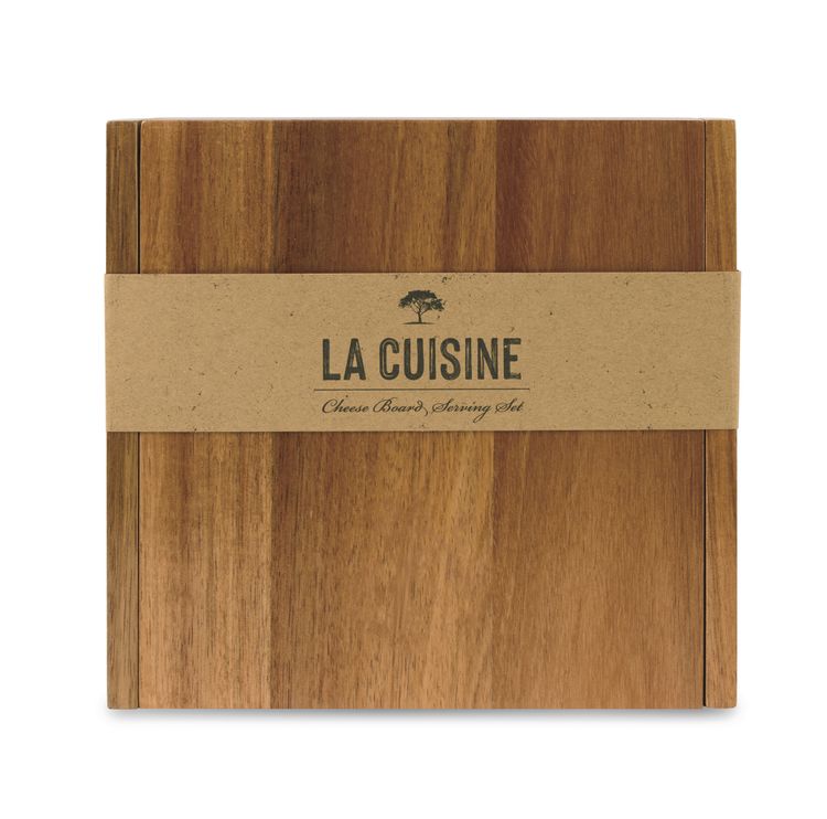This modern Acacia wood cheese board and serving set provides everything need for presenting an appetizer or charcuterie snack. Set includes tools used for hard and soft cheeses; thin knife, chisel knife, serving fork and small spade. Acacia wood cutting board. Stainless steel tools with acacia wood handles. The cutting surface opens to reveal serving set conveniently stored below. Easy magnetic closure. Gift box included: 8.35"x7.56"x1.5". Gift box included: 8.35"x7.56"x1.5" Bamboo and wood products are prone to color variances and will vary between lots Due to the nature of bamboo and wood material, variations in laser imprinting quality and consistency may occur All wood boards will show knife marks when used for cutting and chopping. To maintain use and care, treating board with food grade mineral oil is recommended SBN Additional decoration charges may apply.