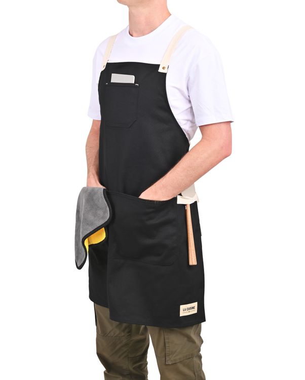 The La Cuisine Cotton Apron features a cross-back strap design that adjusts to fit folks XS to XXL while taking pressure off your neck and distributing the weight across your shoulders and back for marathon-wearing comfort. Multiple pockets and thoughtful loop features allow you to accessorize and stay organized - ensuring that your ‘mise’ is always ‘en place.’ Adjustable straps allow you to customize fit. Chest pocket and dual front spacious pockets to hold utensils and your phone! Pairs perfectly with the La Cuisine Hot Pad and Slowtide Orion Kitchen Towel Made in Pakistan Machine wash cold with like colors Gentle cycle, Mild Detergent, Do Not Bleach, Dry Flat, Warm Iron If Needed SBN Additional decoration charges may apply.