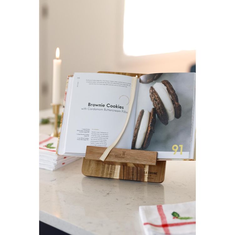 The La Cuisine Sous Chef Recipe Holder keeps cookbooks, tablets, or phones perfectly in view while you cook. Crafted from natural acacia wood, the stand is removable to double as a serving board—functional, stylish, and versatile for every kitchen. SBN Additional decoration charges may apply.