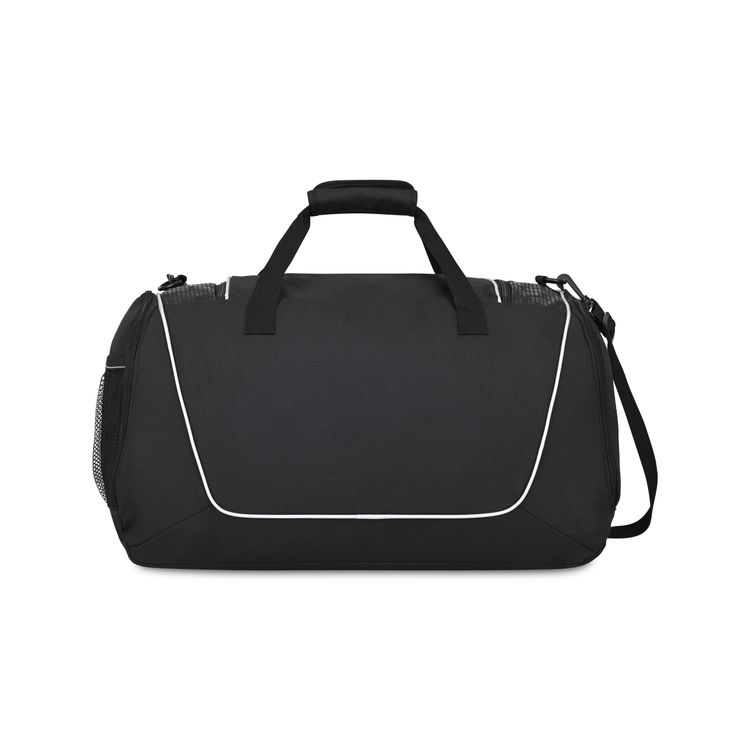 Get performance and utility with the Matrix Sport Bag. Each 600 denier polyester bag features ample storage space with a large U-shaped opening to a zippered main compartment, a side mesh pocket, side and front zippered pockets, a shoe tunnel with ventilating mesh and bungee cords for extra storage. Transport is easy with a removable floor board for extra support, padded grab handles and a removable, adjustable shoulder strap. Tone-on-tone digital print accents provide added appeal. Side mesh pocket and side zippered pocket Padded grab handles Removable, adjustable shoulder strap SBN Additional decoration charges may apply.
