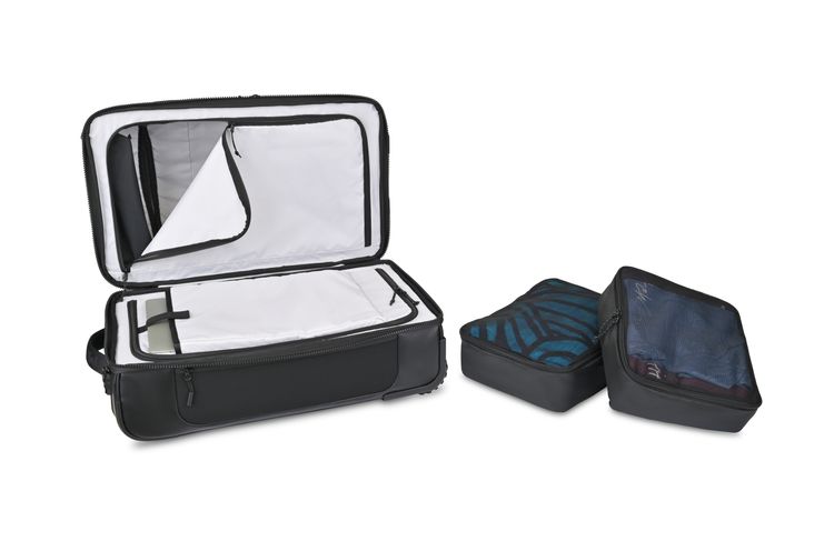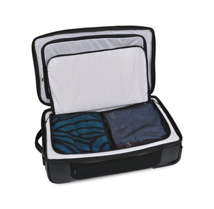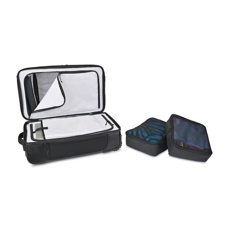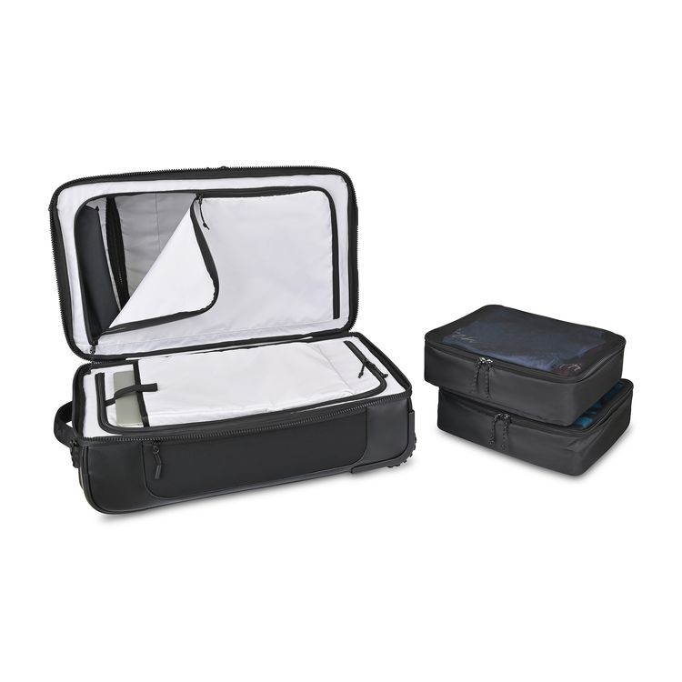 Dual zippered opening reveals two separate compartments; drop bottom contains two packing cubes