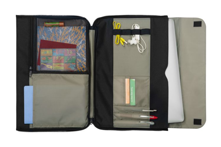A commuter sleeve designed to keep your mobile office up and running. Top flap with hook and loop fasteners. Easy access to interior compartments when flap is open. Interior front slash pocket perfect for storing papers or file folders. Side zippers unzip all the way to easily access all that is inside. Padded laptop compartment sized to fit up to a 15” laptop. Interior features a multi-function organizer with various storage pockets ideal for storing pens, cords, flash drives, a smartphone and more! Slash pocket perfect for storing a notebook or junior padfolio SBN 0.85 Additional decoration charges may apply.