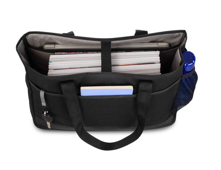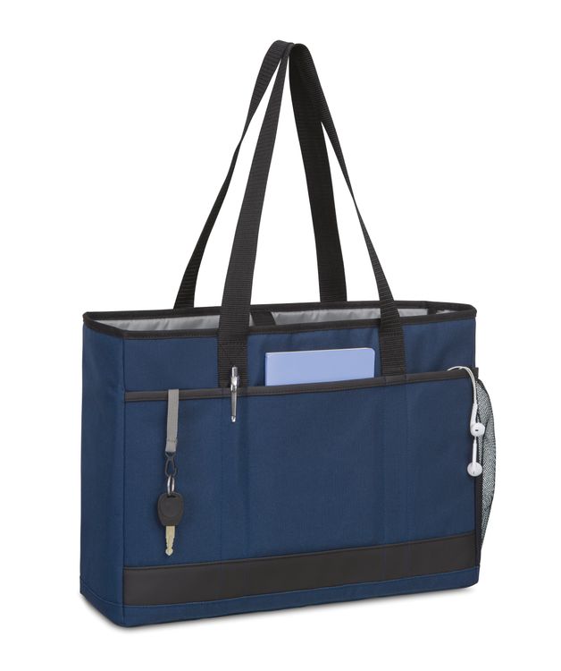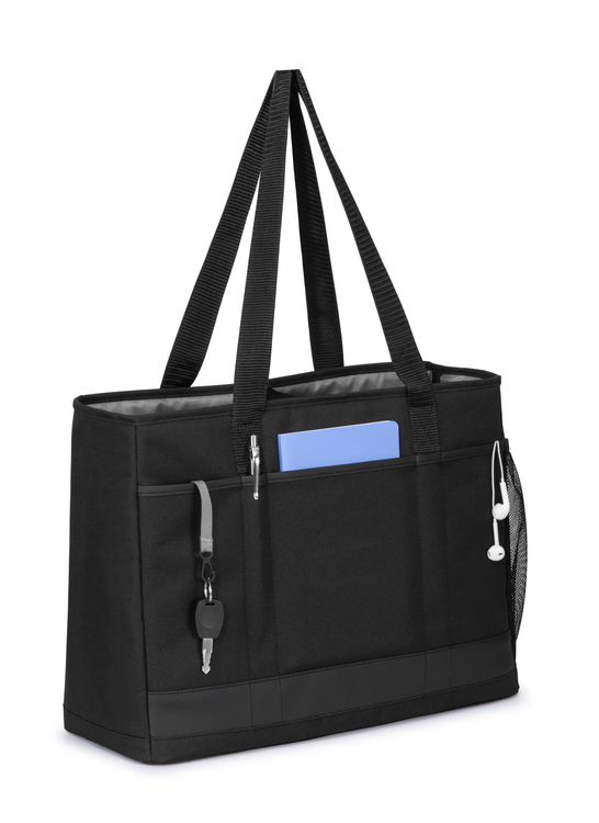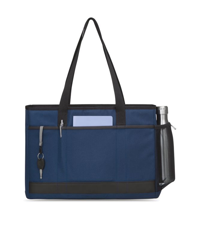 A tote for the modern office. Whether it’s storing your items in a locker, cubby or working in a coffee shop. This tote will keep you organized wherever your “office” is. Large main compartment with hook and loop fastener. Multiple front pockets for keeping all your office needs organized. Key fob. Side mesh pocket. Fully lined and padded interior to keep your electronics safe. Laptop compartment (sized to fit up to a 17” laptop). 25.5” shoulder straps. Laptop compartment (sized to fit up to a 17” laptop) 25.5” shoulder straps SBN 1.16 Additional decoration charges may apply.