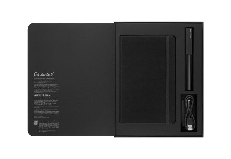 The Smart Writing Set includes the Smart Notebook with its recognizable Moleskine shape and ivory-colored pages, together with the redesigned Smart Pen and Notes App.