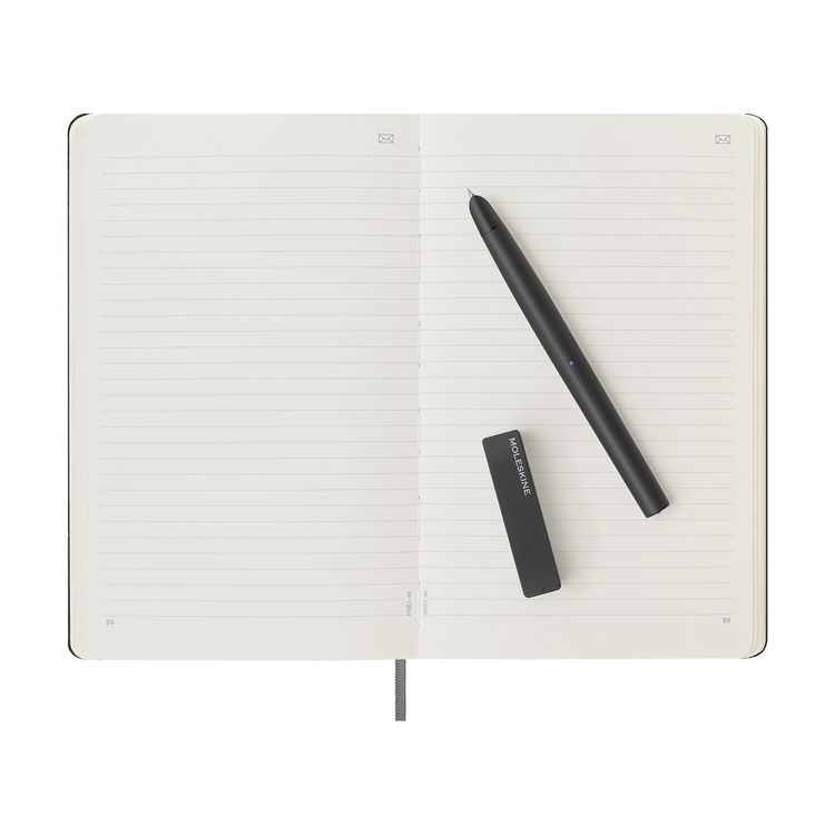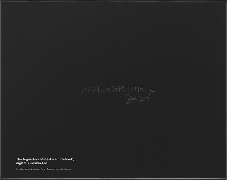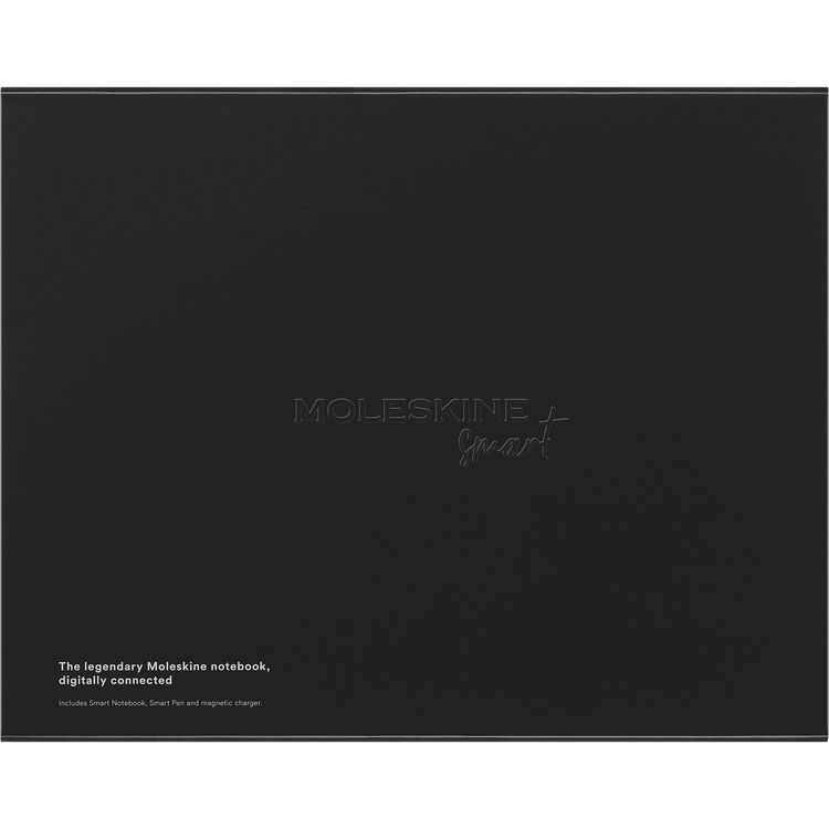 The Moleskine® Smart Writing Set includes a large ruled Smart Notebook, Smart Pen, and free Notes App, giving you an instant digital copy of every page you write. Transcribe, search, edit, and share notes across devices while enjoying the creativity of writing on paper. Featuring 176 ruled pages of acid-free paper, elastic closure, ribbon bookmark, expandable pocket, Smart Pen with magnetic charger, and ink refill—everything you need to capture and digitize ideas. The Set has everything you need to keep your notes safe and digitized Smart Notebook (large, ruled format) with Ncoded paper designed to work with Smart Pen Rounded corners, elastic closure and matching ribbon bookmark Ivory-colored, 100 g/m², acid-free paper: ruled 176 pages (88 sheets) In case of loss' printed on the flyleaf Expandable inner pocket in the back Lies flat, opens at 180° Smart Pen 1 pen tip ink refill Magnetic charger The Moleskine Smart Notebook comes packaged inside of the Smart Writing Set box Add a Custom Band (Item # 405) Box dimensions: 11L 1.25H 8.625W Additional decoration charges may apply.