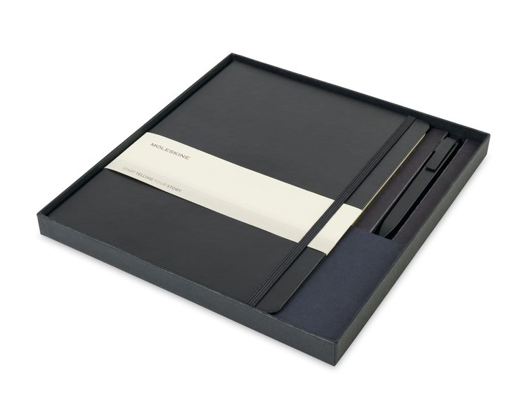 This gift set includes one Hard Cover Ruled X-Large Notebook and one Go Pen packaged in a two-piece Moleskine gift box