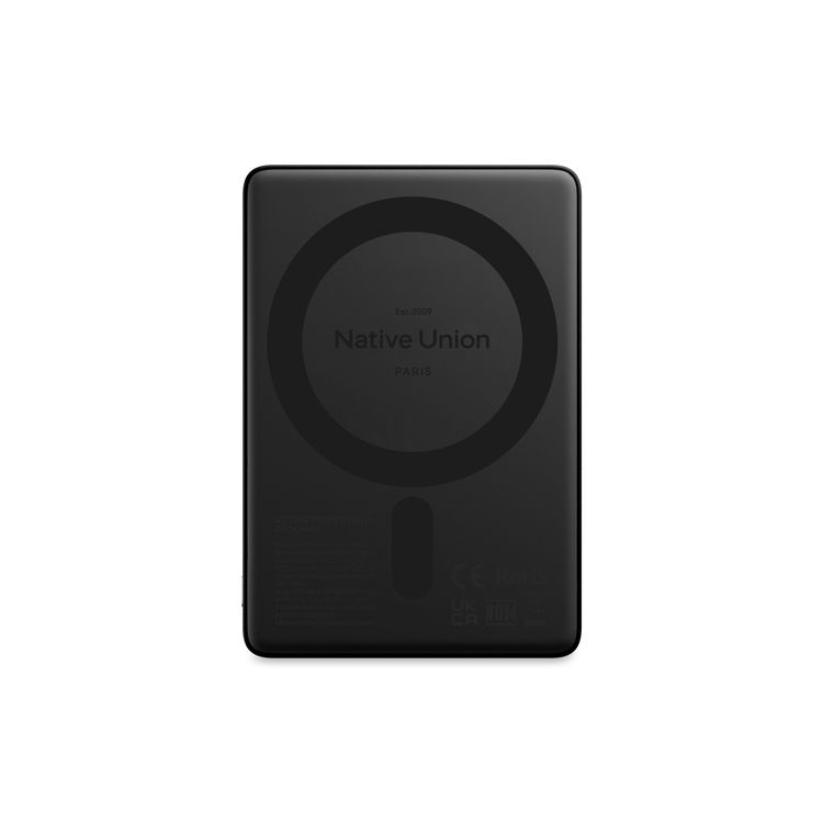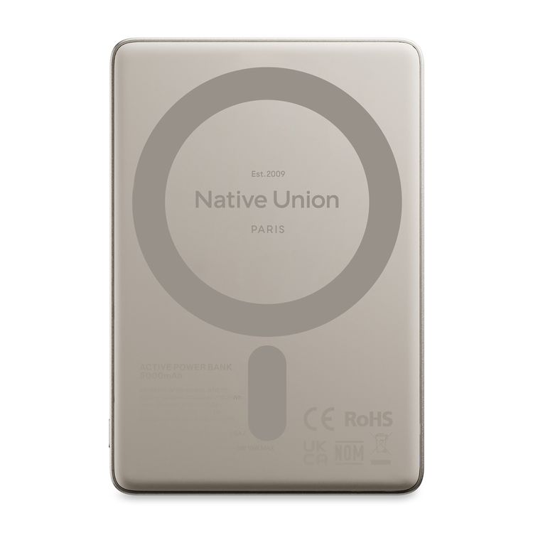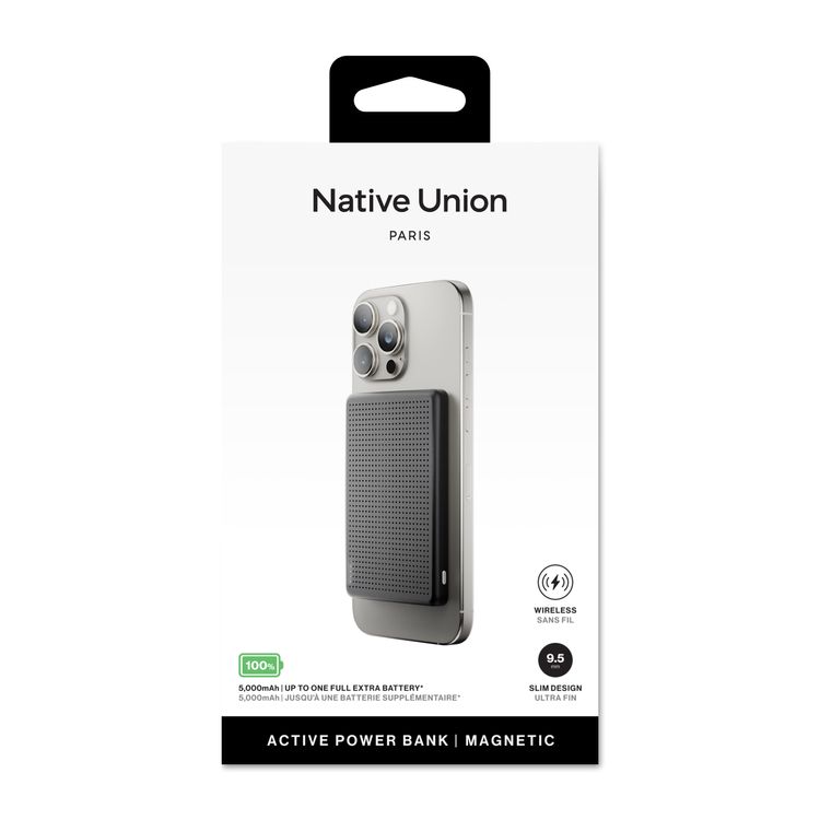 Power that moves with you. The Native Union Active Power Bank 5000mAh is an ultra-slim MagSafe-compatible charger delivering up to 15W wireless or 20W wired fast charging. Strong magnetic hold, pass-through charging, and built-in safety features keep your devices powered securely on the go. Fully charges an iPhone 15 Pro in one go—perfect for travel, work, or daily adventures. Compatible with MagSafe, Qi2, AirPods Pro (2nd Gen and 1st Gen with MagSafe Charging Case), and other Qi-compatible devices Wired compatible with iPhone 7 or earlier, AirPods (1st & 2nd Gen), iPad Recharge Powerbank Time (via PD30W Charger): 110mins Includes: Active Power Bank, 15 CM Braided Cable USB-C to USB-C Gift box dimensions: 4.33"L x 7.17"H x 0.79"W New Additional decoration charges may apply.