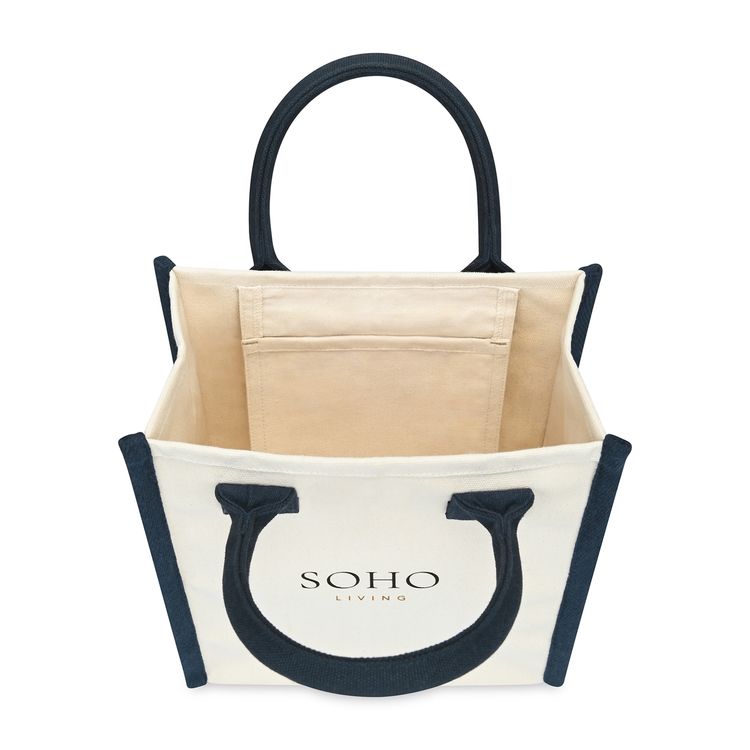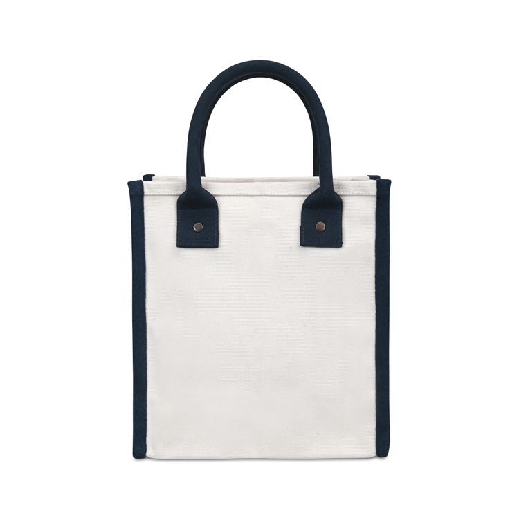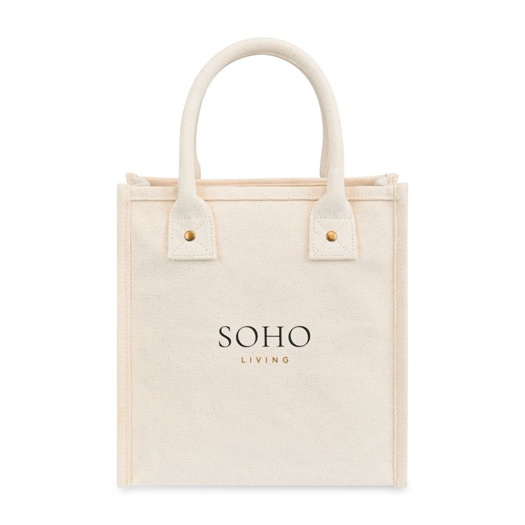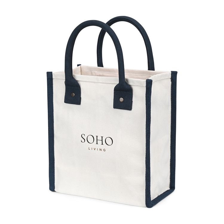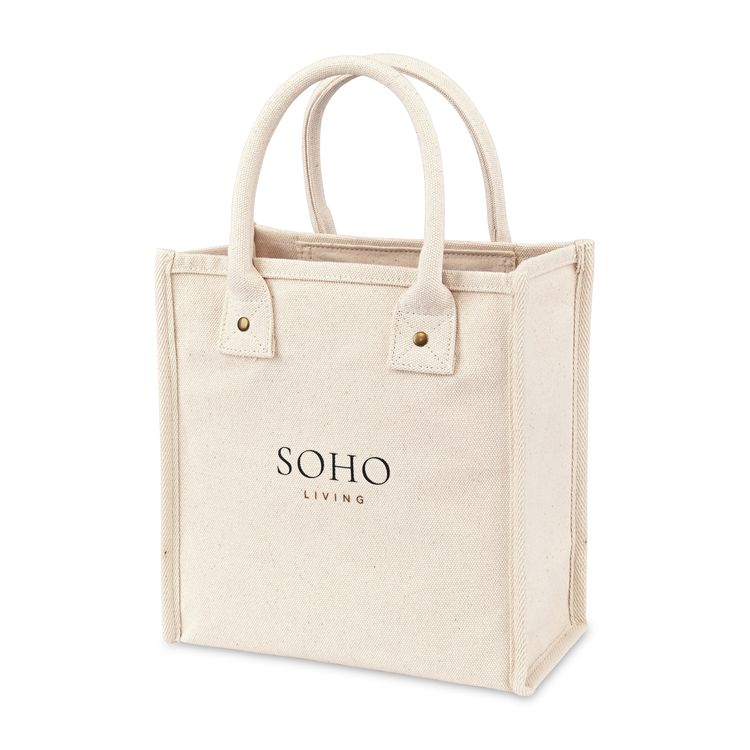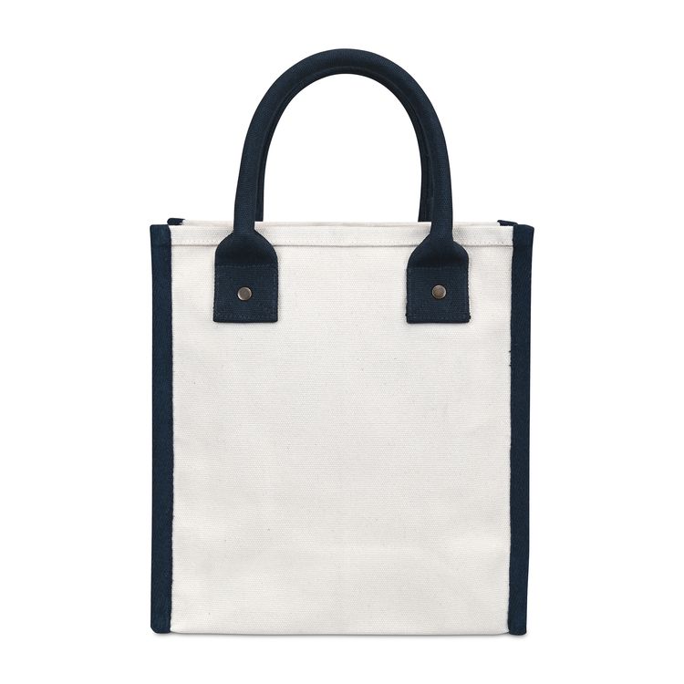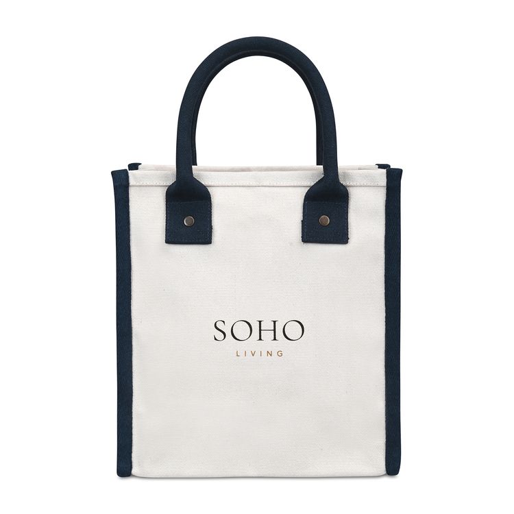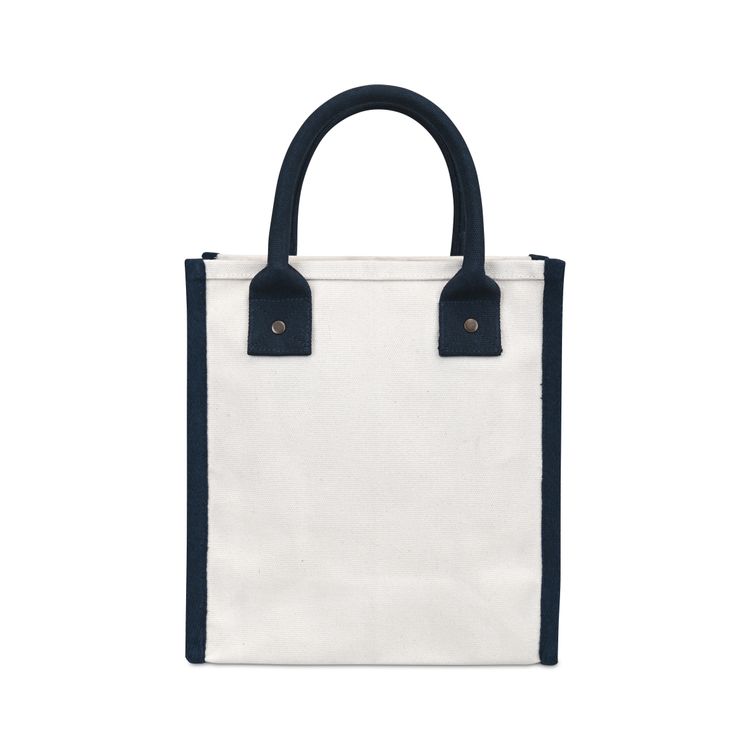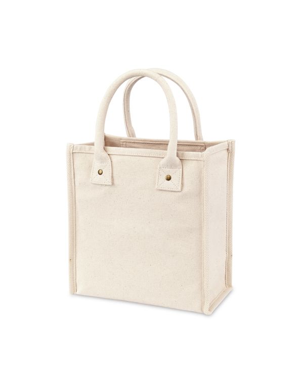 Chic and versatile. The Petite Market Street Tote is a stylish canvas carryall sized just right for daily essentials. Featuring rolled padded handles for easy carrying, antique brass rivet details, and an interior pocket for organization, it’s perfect from workdays to weekends. Add a logo or inspiring message to make it uniquely yours. Pairs perfectly with Eco-bow box #977 for gifting. Due to the nature of the material content, the finished material can have subtle color variances SBN 2.55 Additional decoration charges may apply.