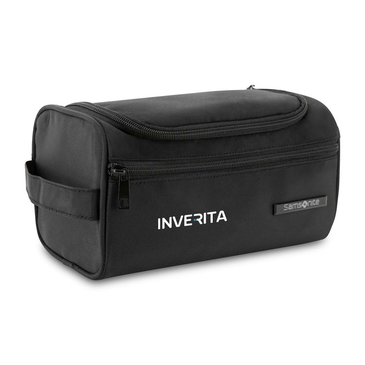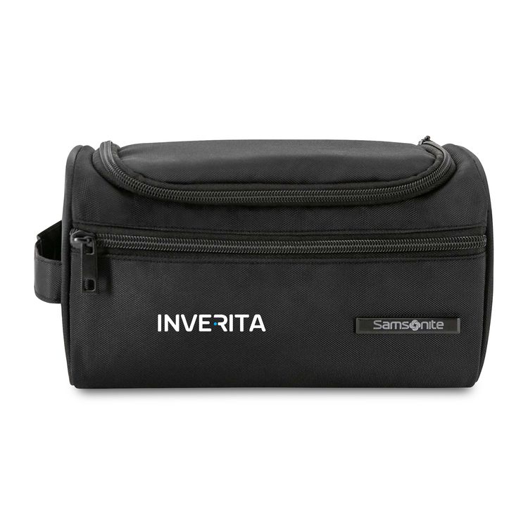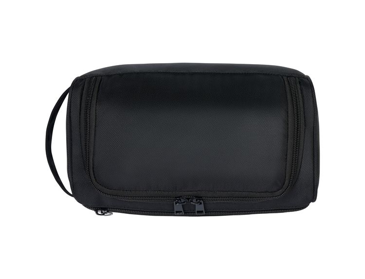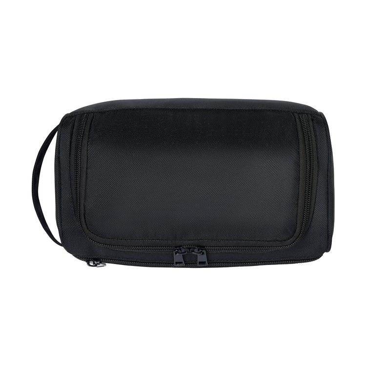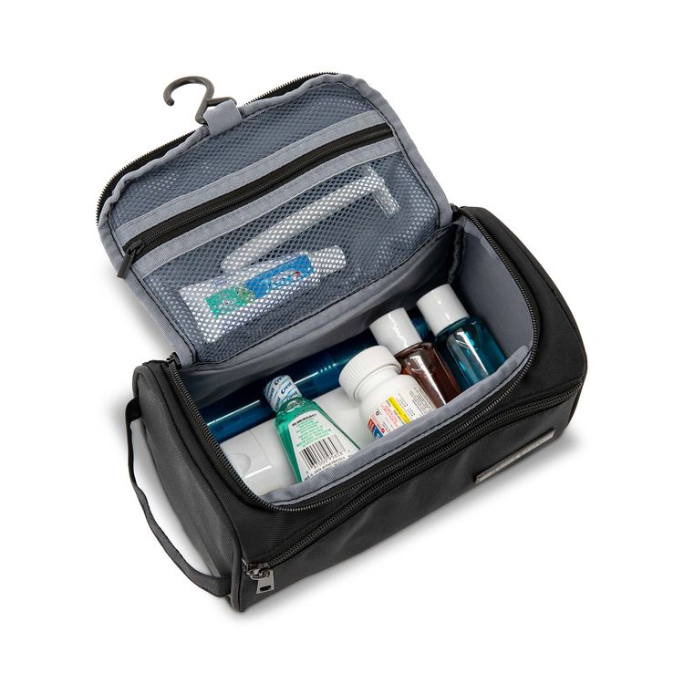 The perfect size for any traveler fits well in any bag or luggage. Top zip opening to the spacious main compartment. Front zip pocket to store smaller essentials. Interior zipper mesh pocket for added organization. Includes a side carry handle. Interior hook for the option to hang while traveling. Additional decoration charges may apply.