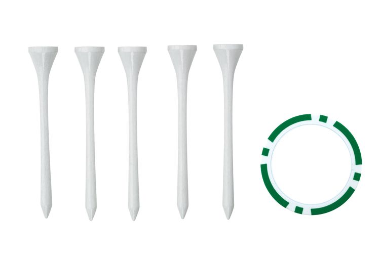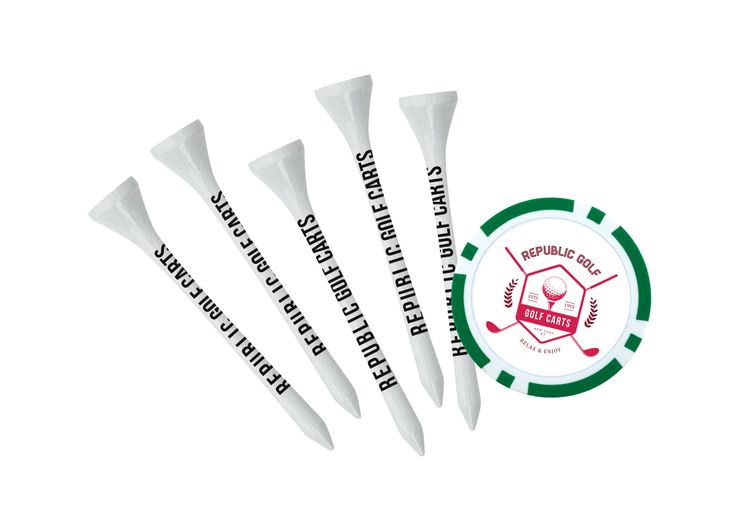 A fun and affordable way to promote your brand on the golf course! Includes 5 imprinted 2-3/4" tees and one poker chip ball marker imprinted on both sides in an individual polybag. Additional decoration charges may apply.