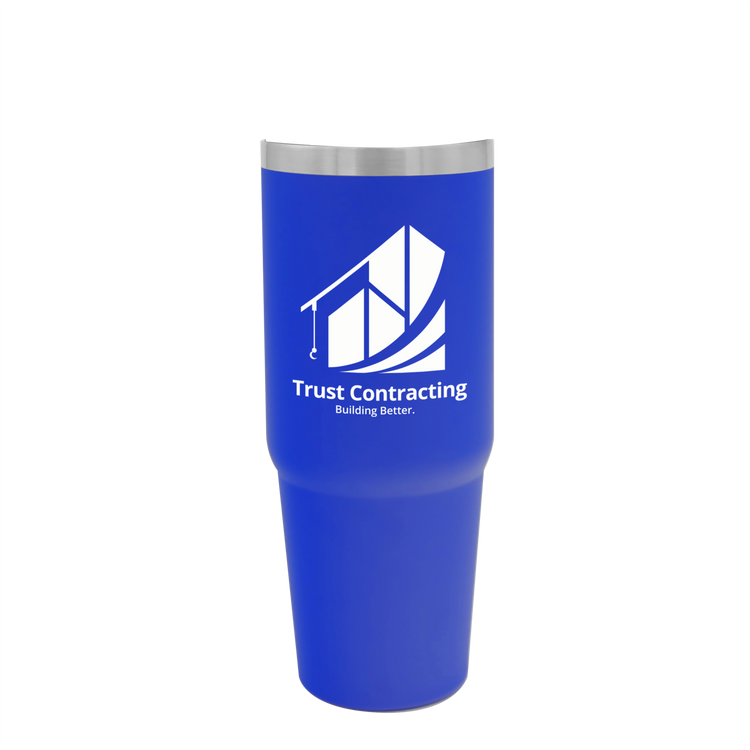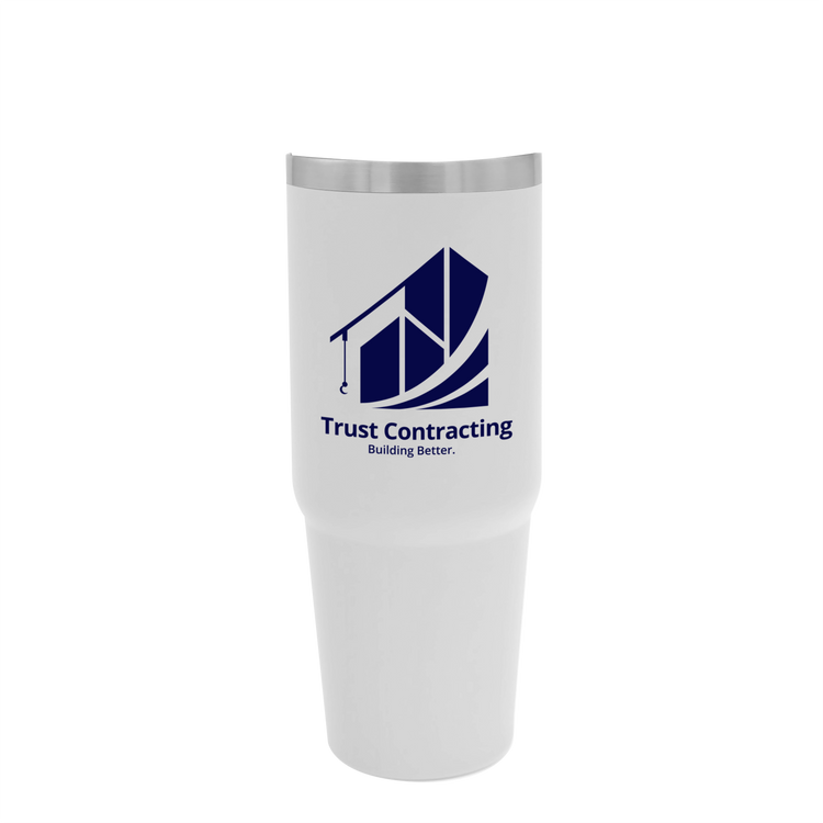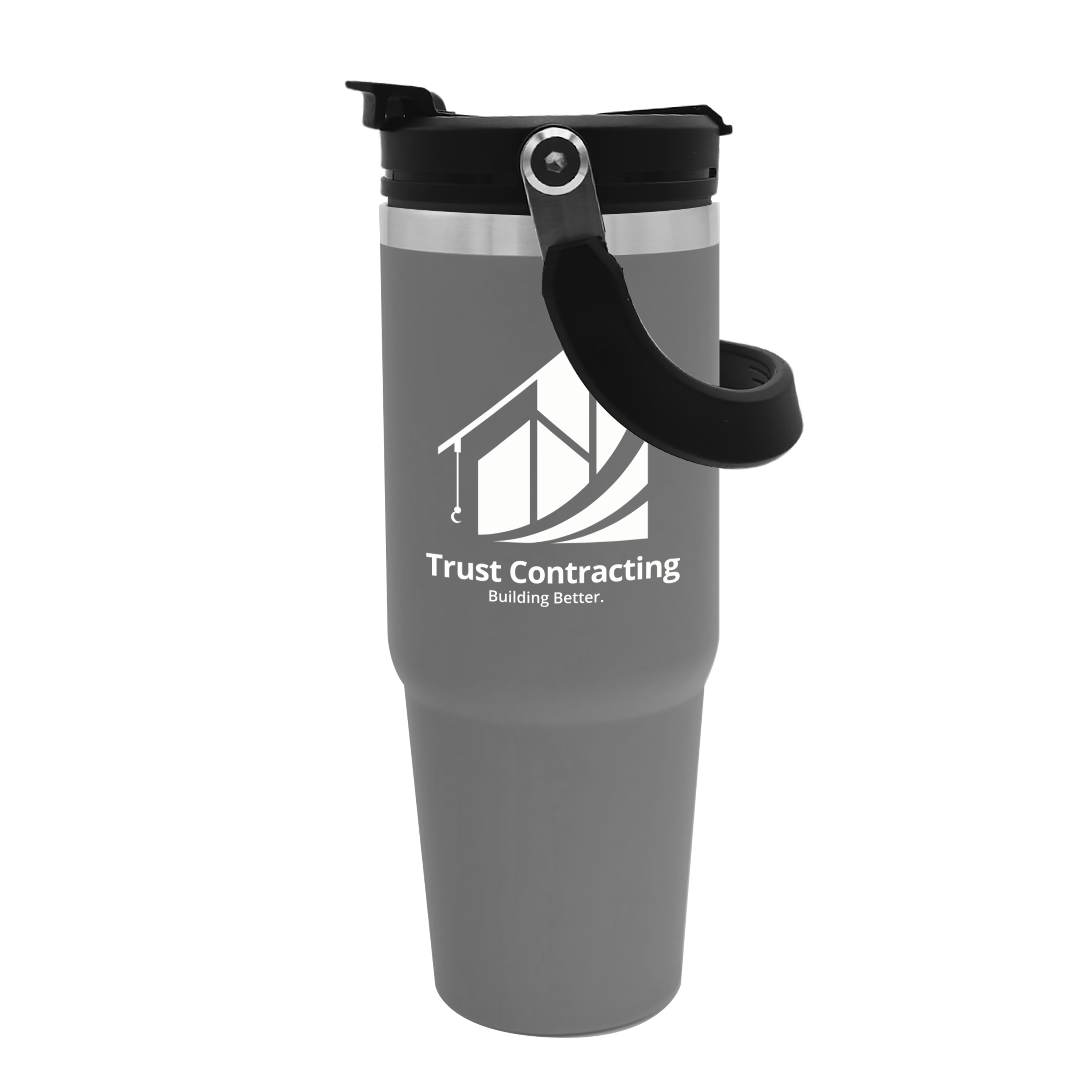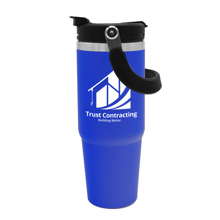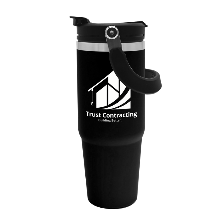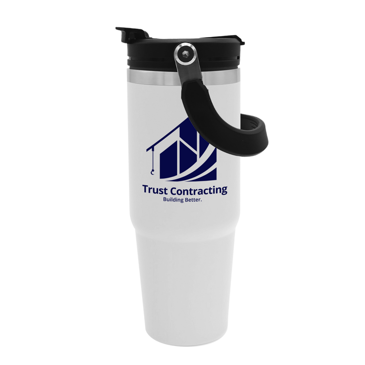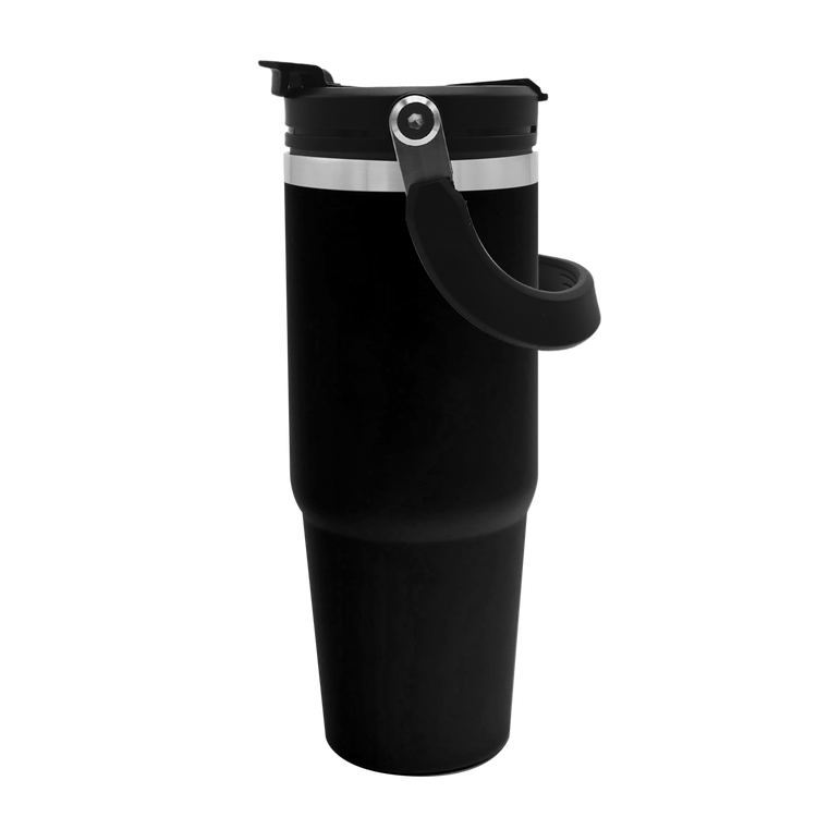 Embark on your next adventure with this 30 oz. stainless steel tumbler. Its double-wall construction keeps beverages hot or cold for hours, while the fold-down handle makes it easy to grab and go. The screw-on, spill-resistant lid lets you choose your sip style with both a flip-up straw and drink-through opening. Durable, functional, and ready for any journey, this bottle is built to keep up wherever life takes you. Additional decoration charges may apply.