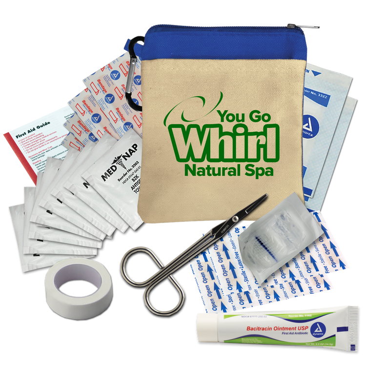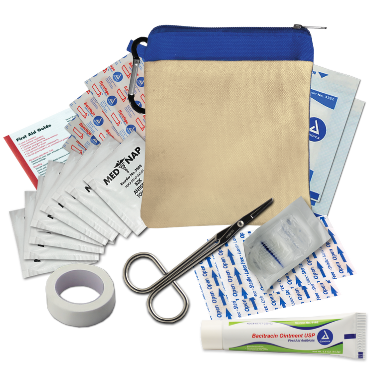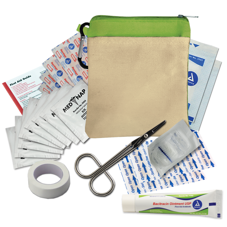 Keep safety close at hand with this compact 100% cotton canvas pouch designed as a portable first aid kit. Featuring a colorful accent band, zippered closure, and attached carabiner, it clips easily to bags or backpacks for quick access. Inside, you’ll find a well-stocked assortment of essentials for treating minor cuts and scrapes, including adhesive bandages, antiseptic towelettes, first aid cream, gauze pads, and scissors. It’s the perfect companion for home, travel, or outdoor adventures. Additional decoration charges may apply.