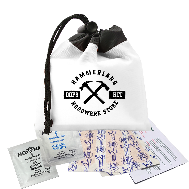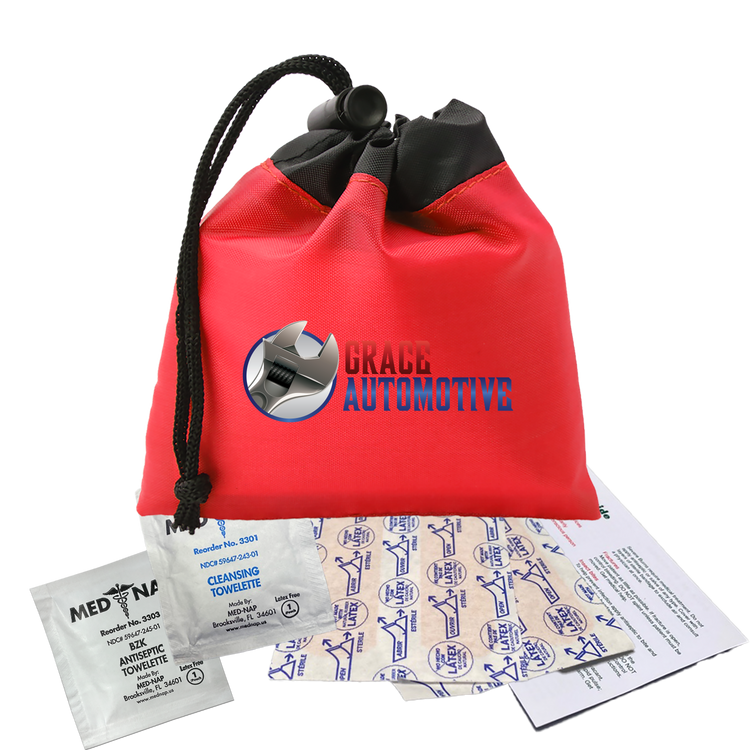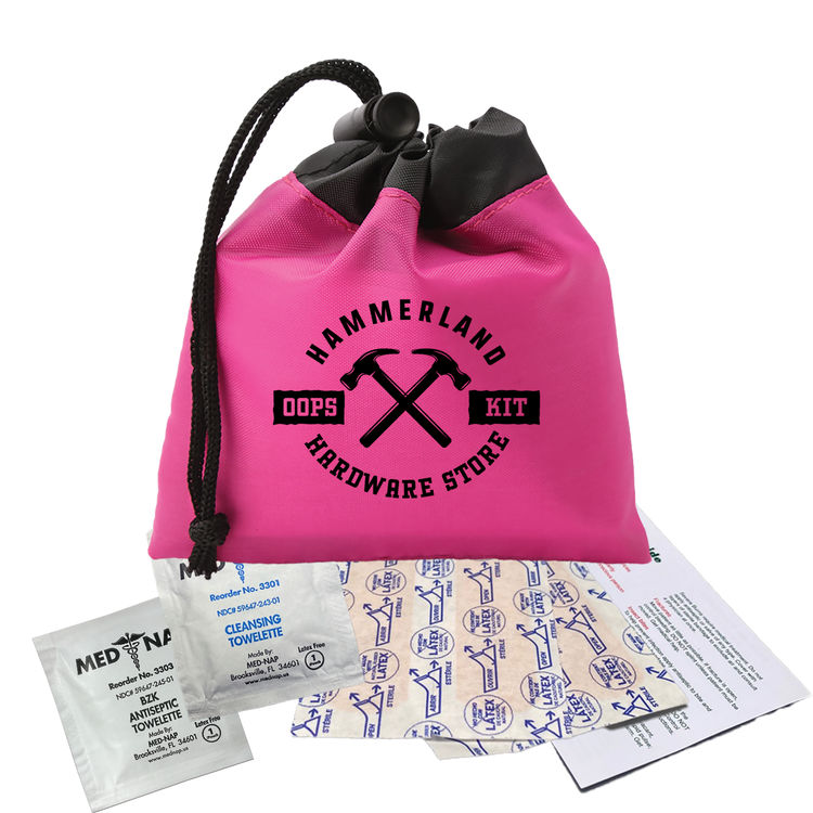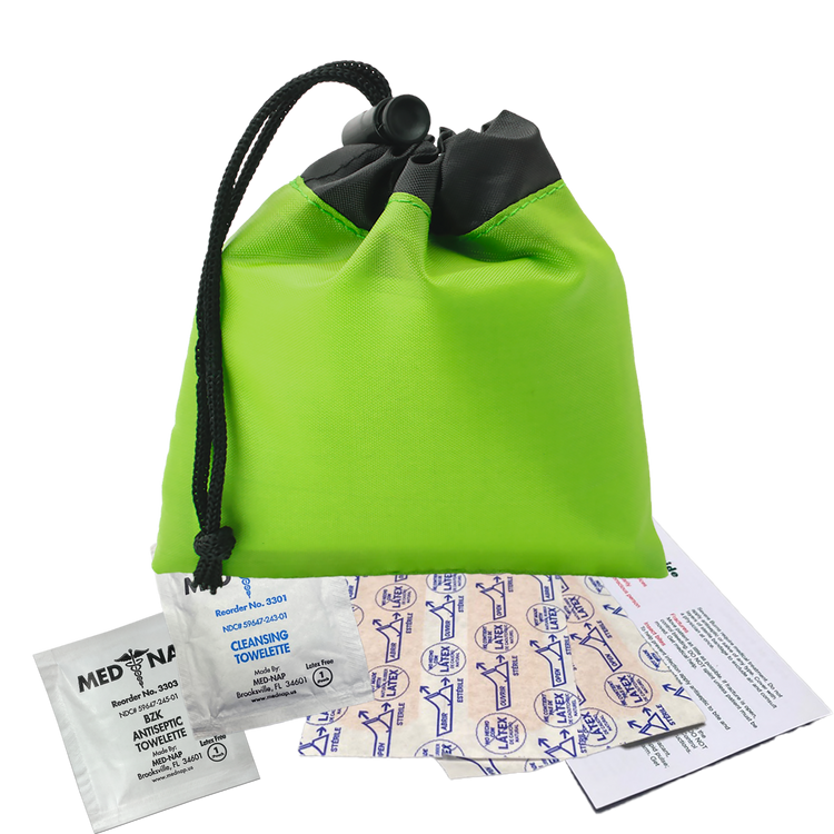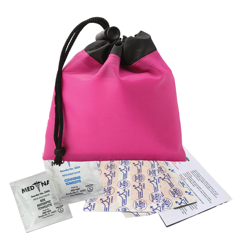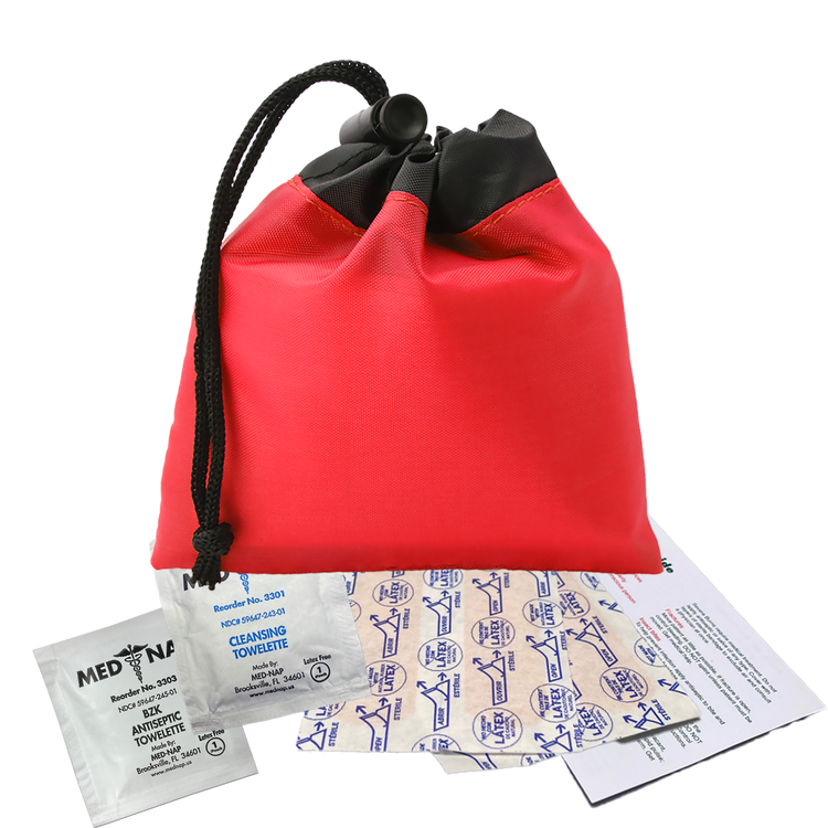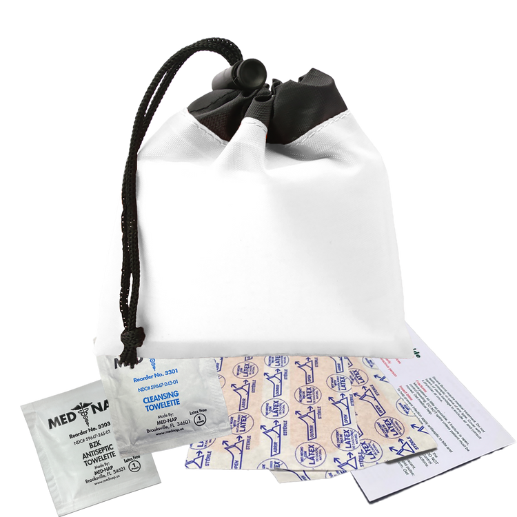 Be prepared for minor cuts or scrapes with this compact polyester first aid pouch. The two-tone design with black trim adds a sleek touch, while the drawstring with cord lock keeps contents secure and easily accessible. It includes 4 adhesive bandages, 1 antiseptic towelette, 1 cleansing towelette, and a first aid guide, making it perfect for events, travel, or everyday carrying. Additional decoration charges may apply.