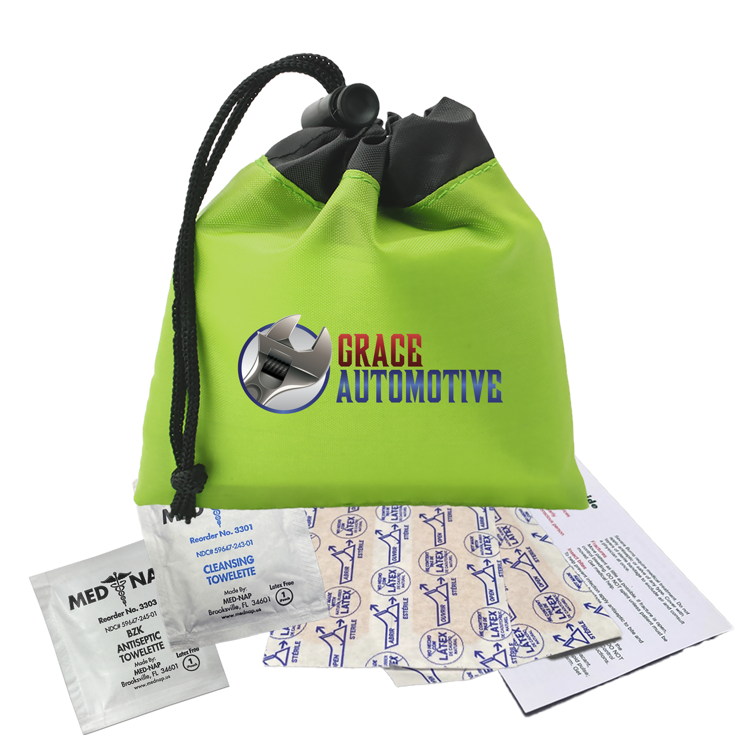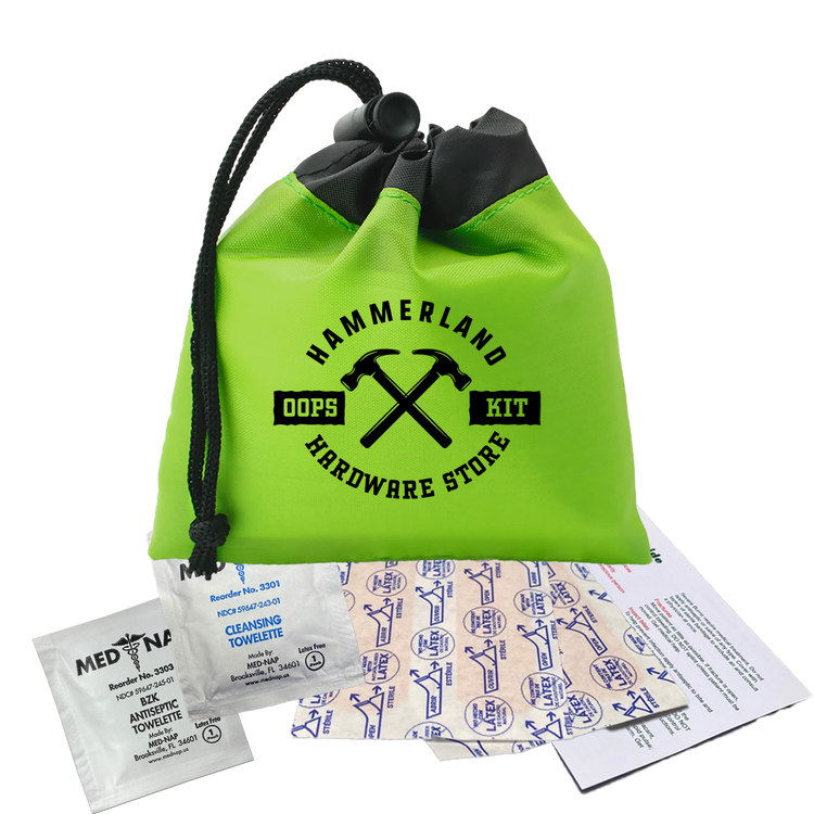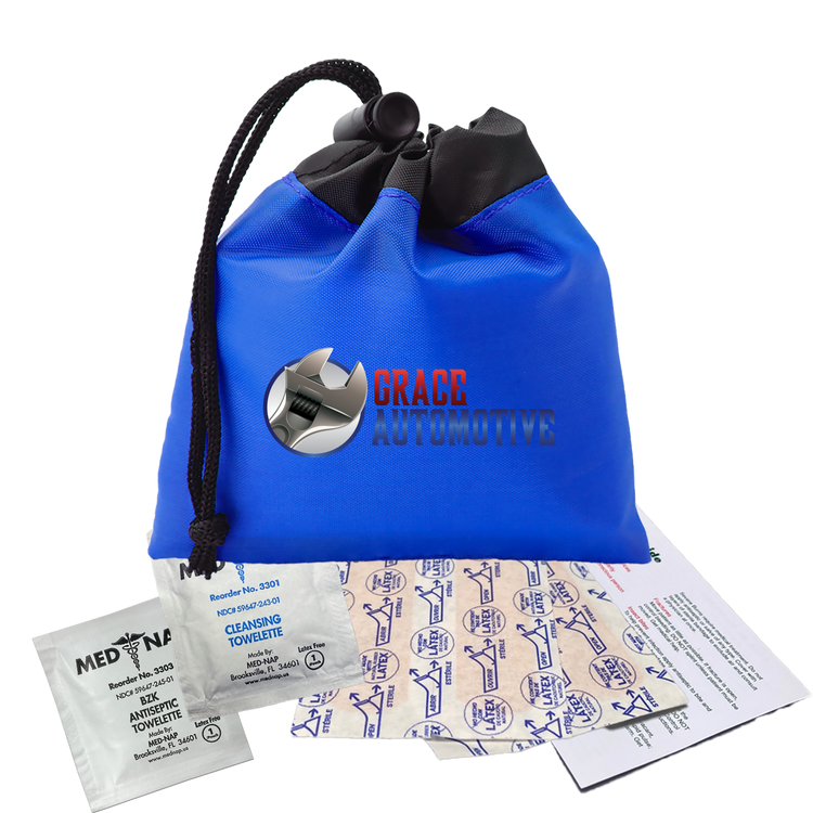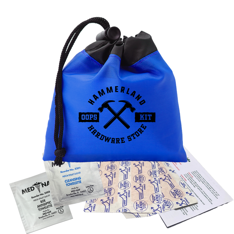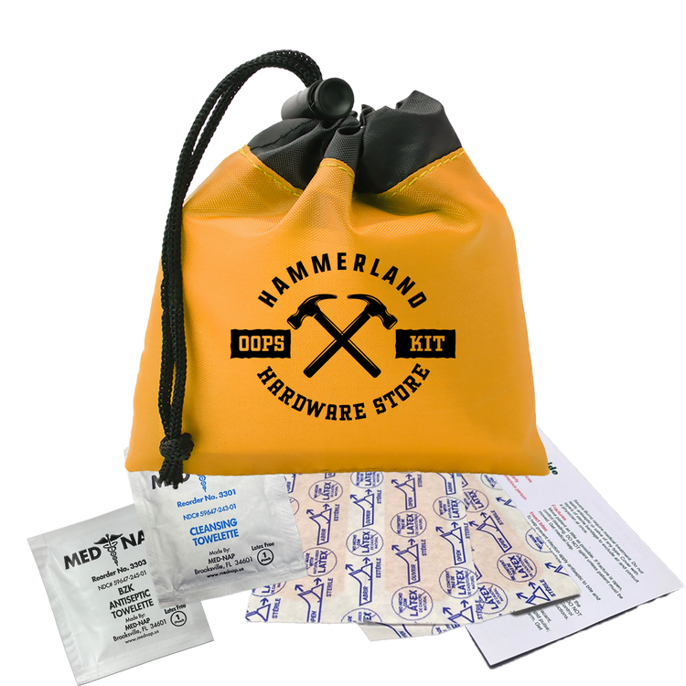 Be prepared for minor cuts or scrapes with this compact polyester first aid pouch. The two-tone design with black trim adds a sleek touch, while the drawstring with cord lock keeps contents secure and easily accessible. It includes 4 adhesive bandages, 1 antiseptic towelette, 1 cleansing towelette, and a first aid guide, making it perfect for events, travel, or everyday carrying. Additional decoration charges may apply.