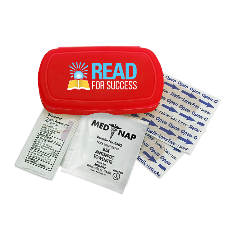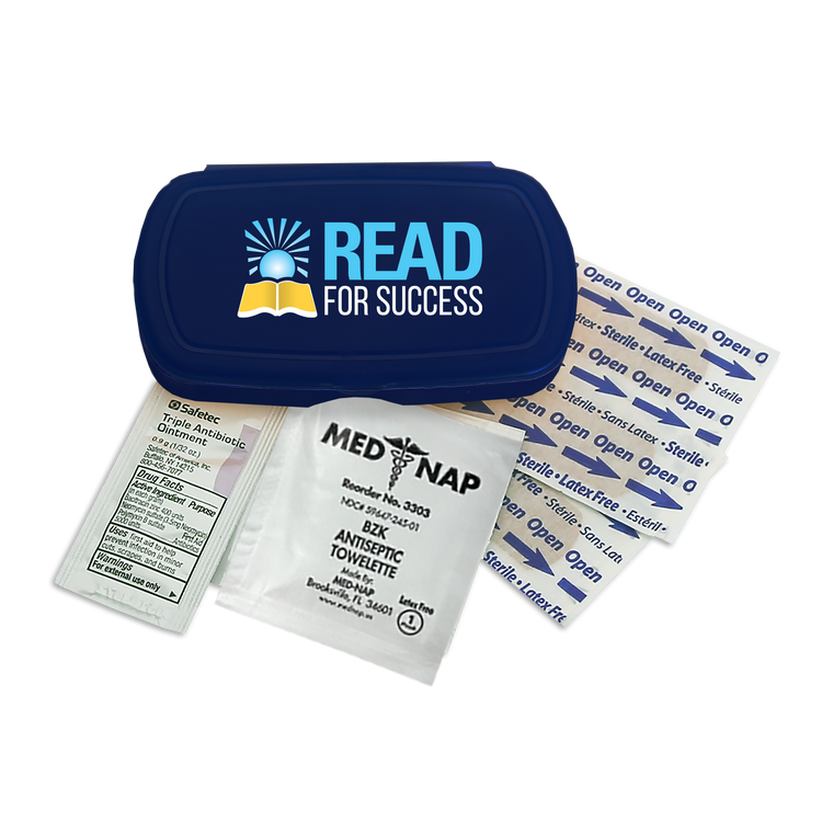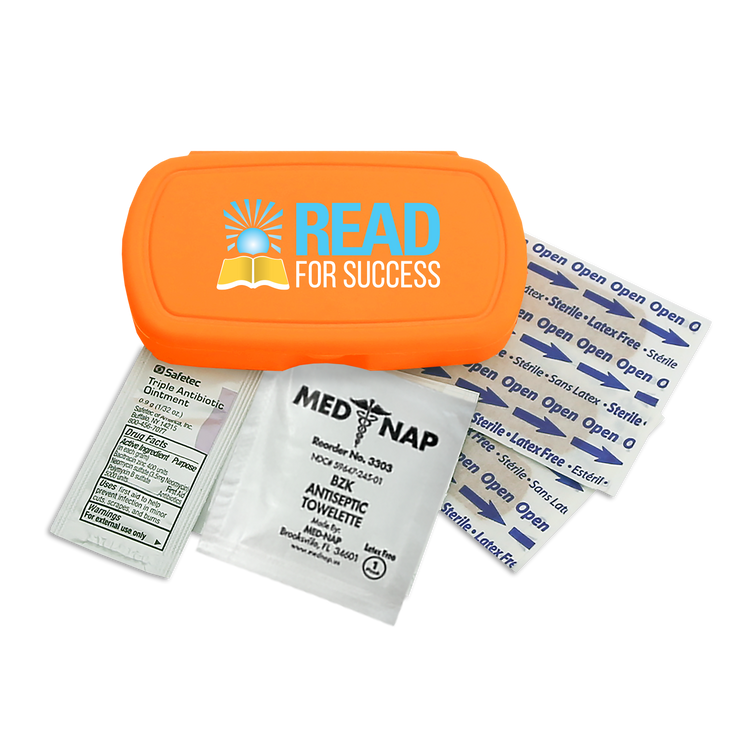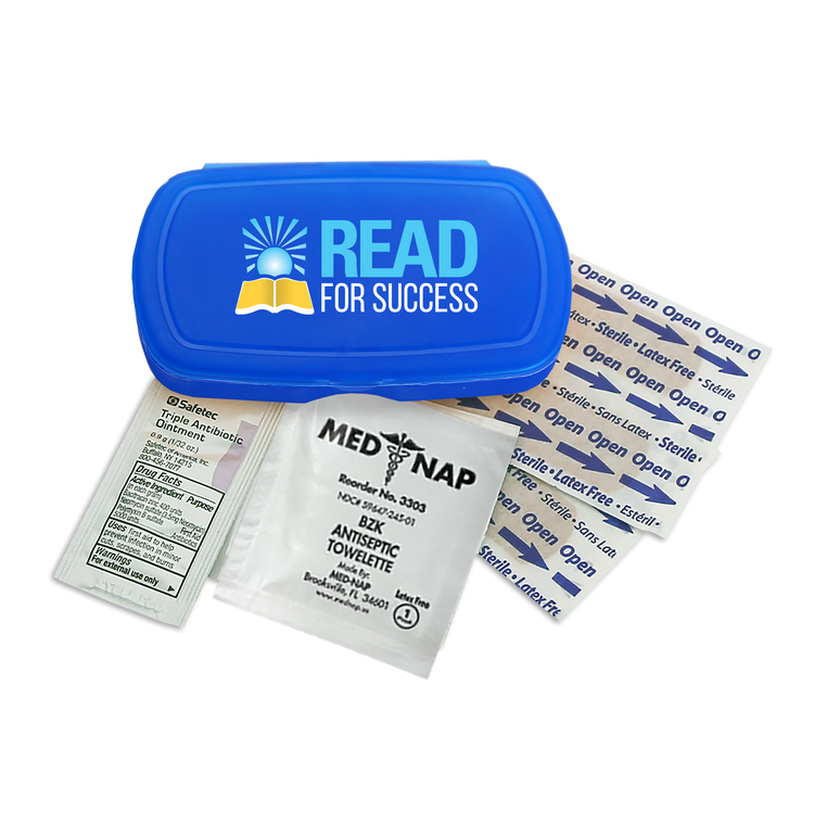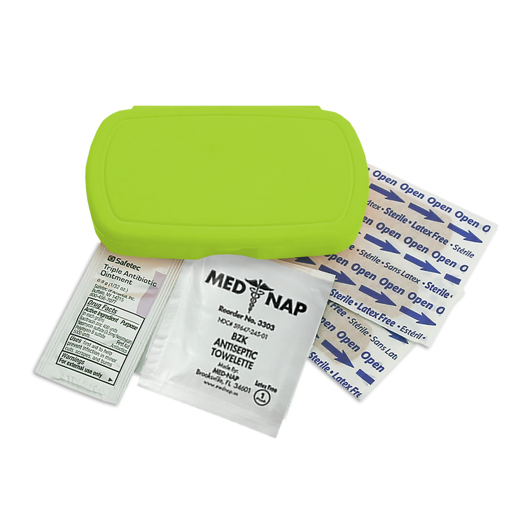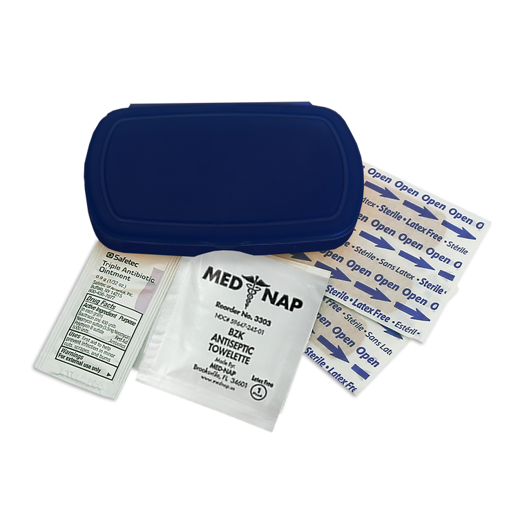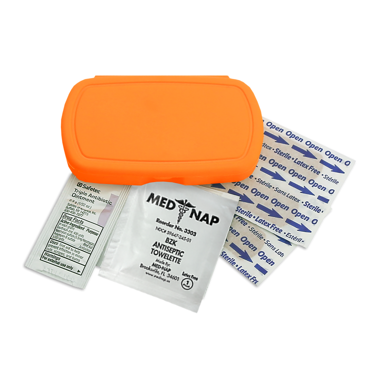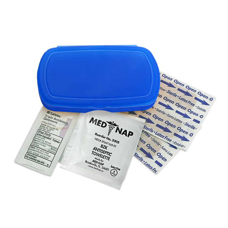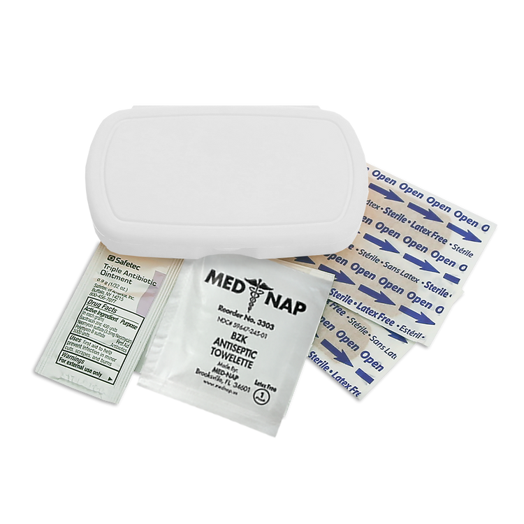 Be prepared on the go with this compact, travel-friendly first aid kit that includes four adhesive bandages, one antiseptic towelette, and one triple-antibiotic ointment packet. Perfect for minor cuts and scrapes, its convenient size makes it easy to slip into a backpack, purse, or glove compartment. Additional decoration charges may apply.