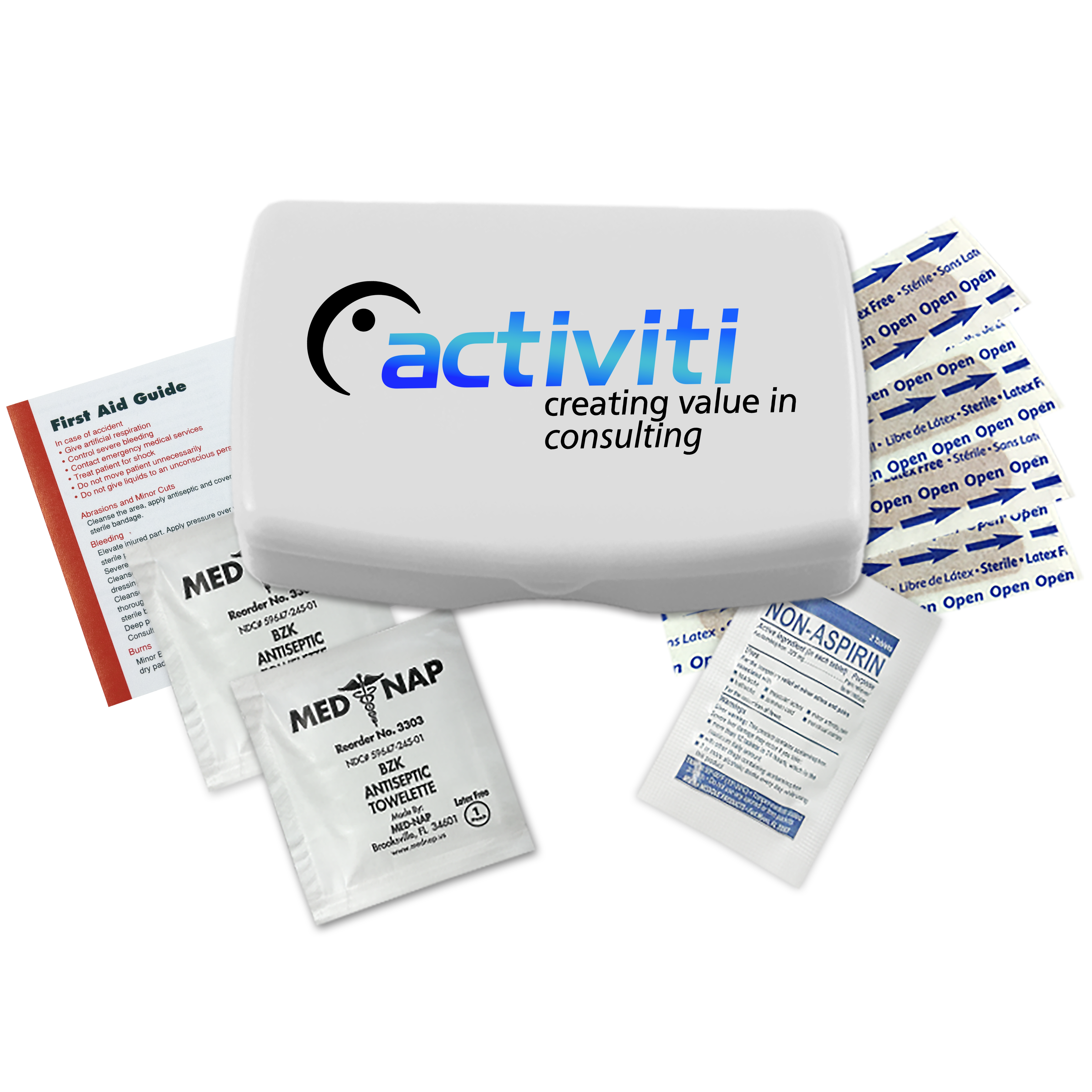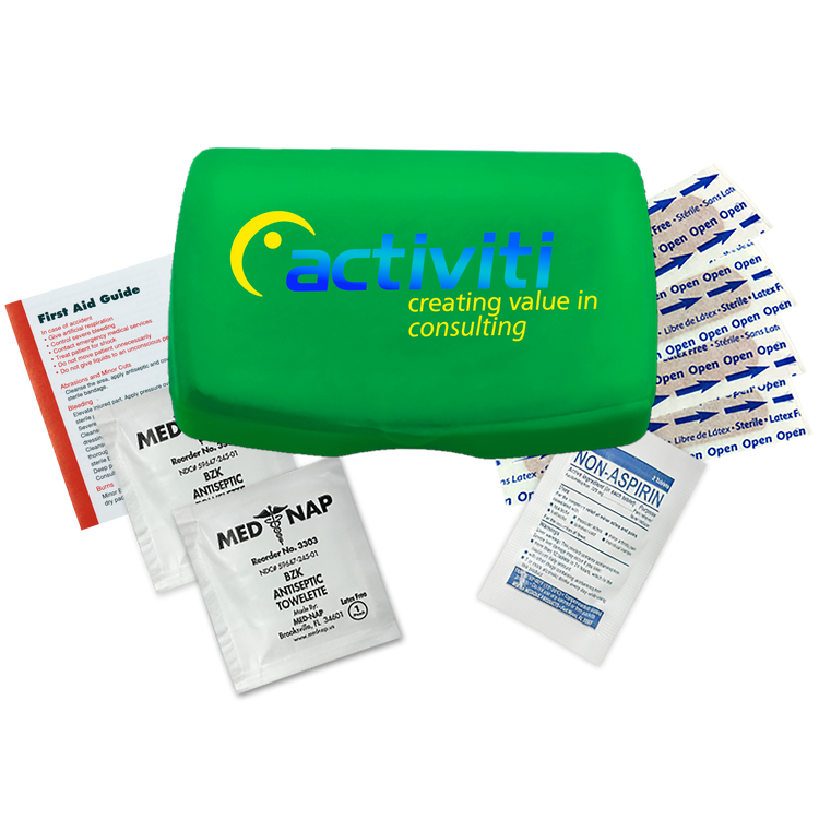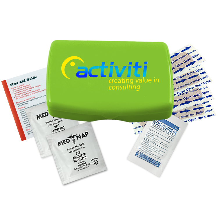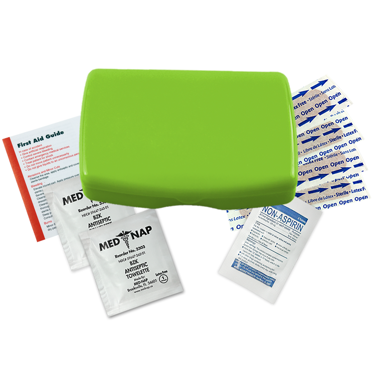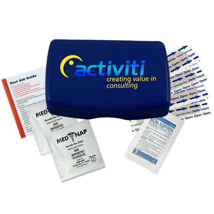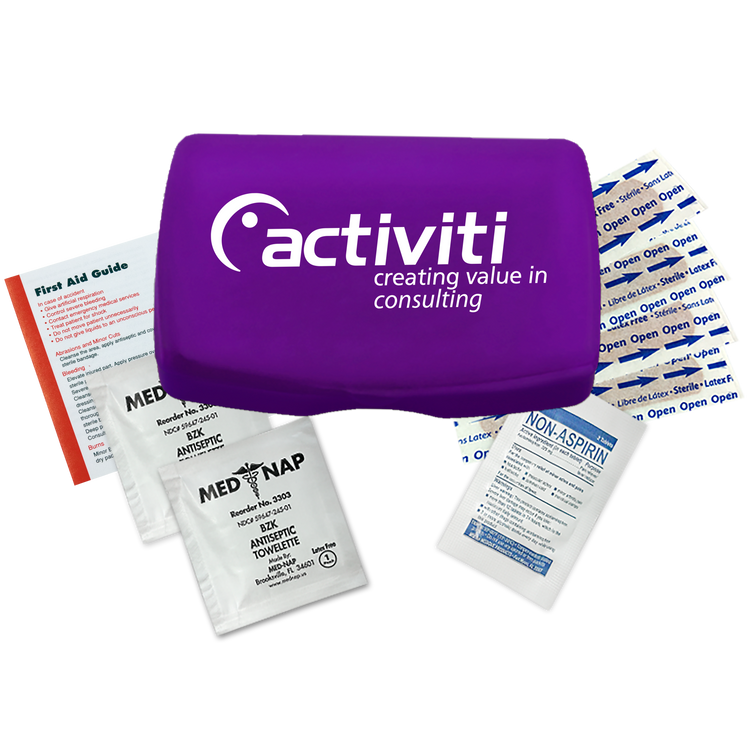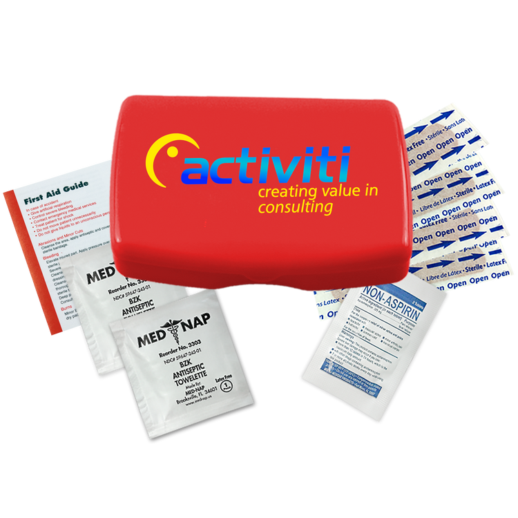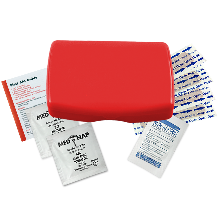 This first aid kit keeps you prepared for the unexpected when away from home. Compact enough to easily fit in backpacks, purses, and glove compartments, it comes in a durable hinged box and includes four adhesive bandages, a non-aspirin pain reliever packet, two antiseptic towelettes, and a short first aid guide. Additional decoration charges may apply.