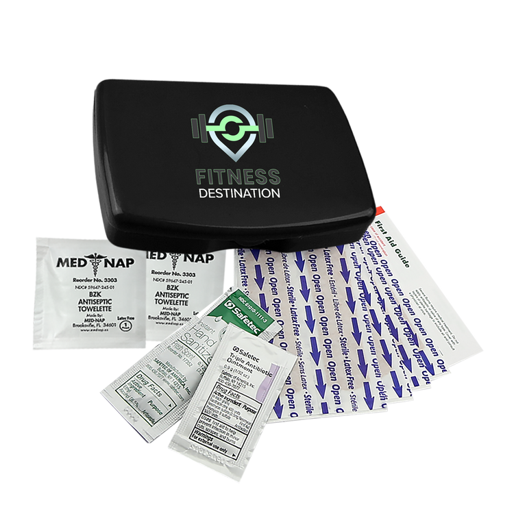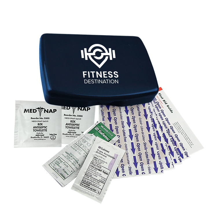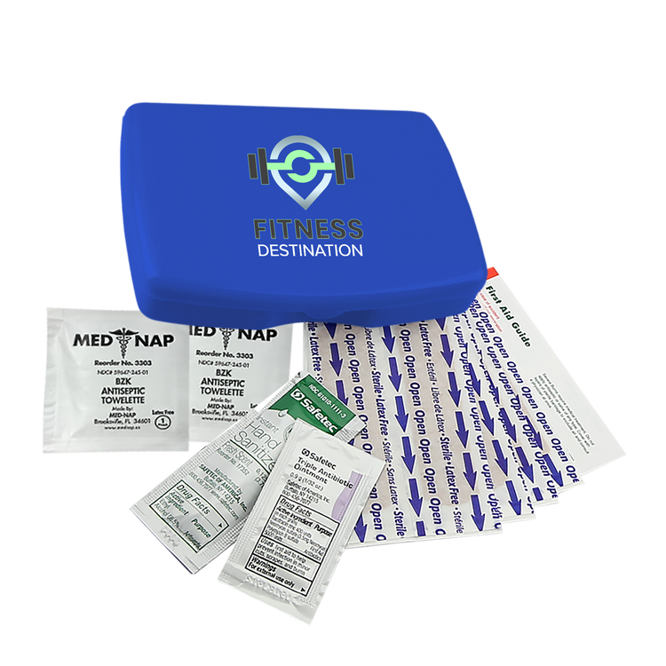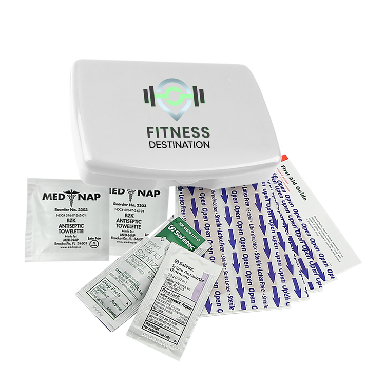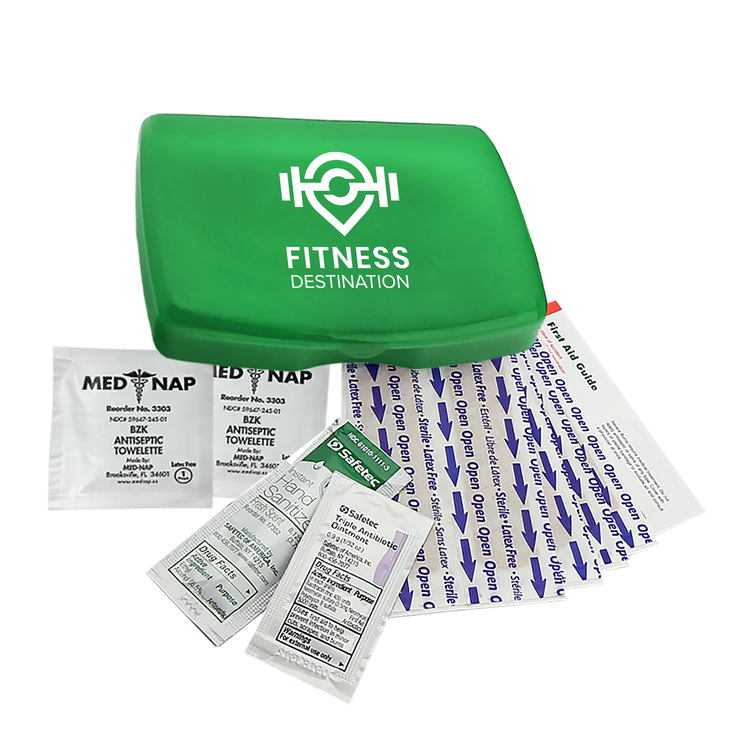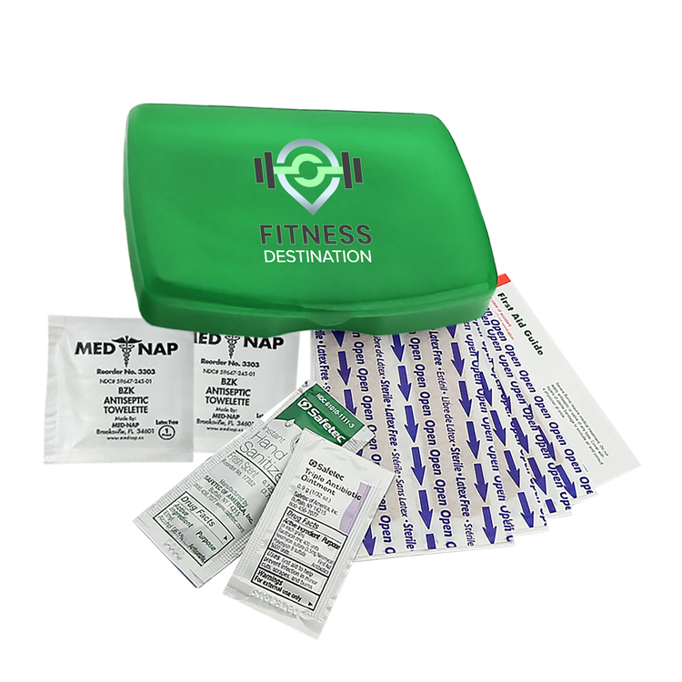 Be prepared for everyday scrapes and bumps with this compact and portable first aid kit. It includes eight adhesive bandages, two antiseptic towelettes, a hand sanitizer packet, a triple-antibiotic ointment packet, and a first aid guide for added peace of mind. Easy to store in a backpack, purse, or glove compartment, it’s a smart choice for travel, outdoor activities, or everyday use. Additional decoration charges may apply.