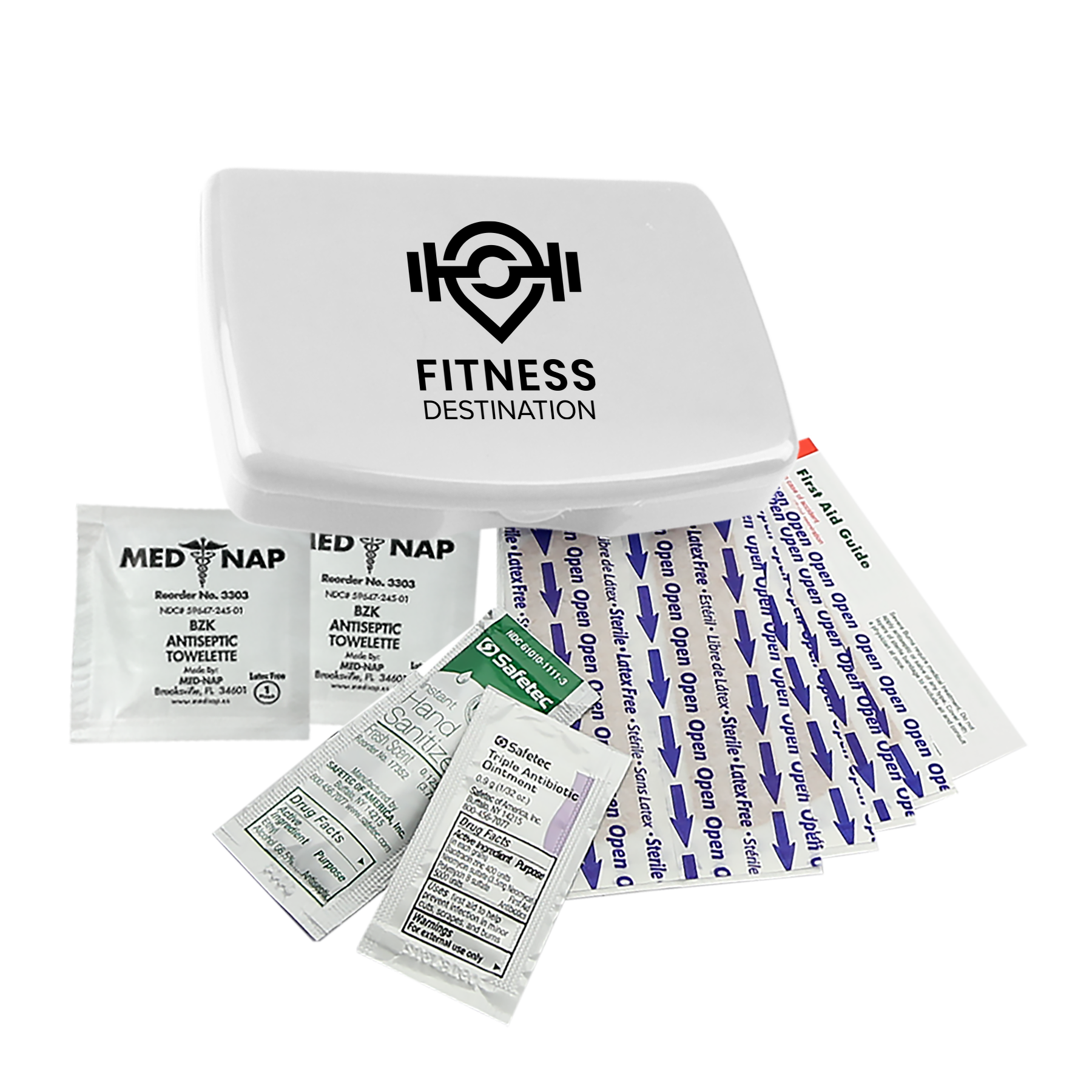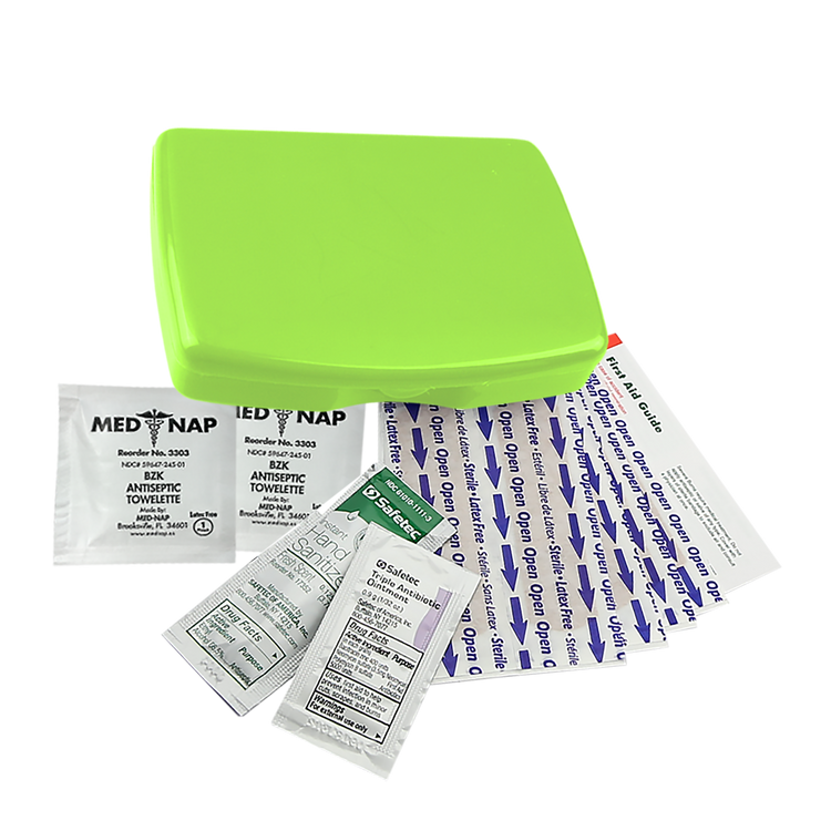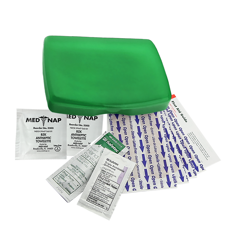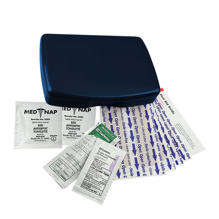 Includes: 8 adhesive bandages, 1 hand sanitizer packet, 2 antiseptic towelettes, 1 triple-antibiotic ointment packet, first aid guide